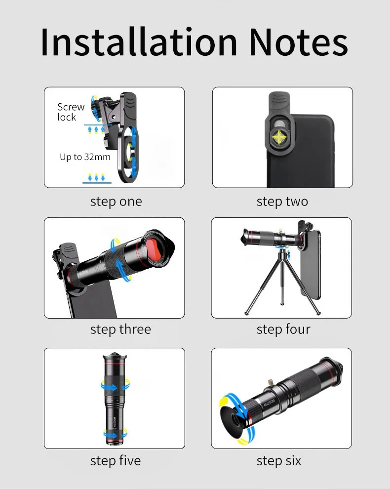 Особенности: 1. Телескоп может использоваться как монокуляр. 2. Подходит для большинства мобильных телефонов, включая флип-телефоны и бар-телефоны, телефон имеет заднюю камеру, может быть подключен к телескопу через зажим. 3. Мобильный телефон может быть улучшен. 4. Подходит для просмотра игр, концертов, туризма, наблюдения за животными, съемки на дальние расстояния и т. Д. 5. Частный детектив фотографирует экспертизу, геологоразведку, управление лесным хозяйством, планирование железнодорожных портов и т. Д. Параметры: Название: 48X телеобъектив для камеры телефона Увеличение продукта: 48x Размер линз: 175*45 мм Спецификация резьбы: 40 мм спереди/17 мм в конце Вес линзы: 0,18 кг Полный вес коробки конфигурация: 0,33 кг Полный вес коробки конфигурации: около 0,42 кг Конфигурация кузова: Телеобъектив 48X * 1 Универсальный пластиковый зажим * 1 Капюшон * 1 Маска для глаз * 1 Металлическое кольцо * 1 Пылезащитный чехол * 1 Двухсекционный металлический штатив * 1 Руководство * 1 Ткань для очистки * 1 Примечание: 1. Пожалуйста, используйте его осторожно, потому что объектив точно регулируется, если он падает или ударяется, поле зрения может не совпадать, и изображение будет отклоняться, nbsp 2. Пожалуйста, не погружайтесь в воду. Если он попадет в воду, пожалуйста, восстановите его быстро. 3. Пожалуйста, не смотрите на солнце абсолютно, ваши глаза могут иногда болеть и слепить. HD Telefon объектив камеры Универсальный 48X телескоп зум телескоп мобильный телефон объектив для iPhone Xiaomi Huawei Samsung смартфонов