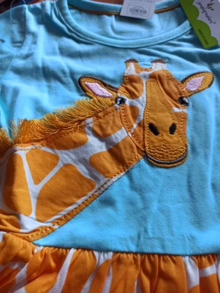 Это такая прелесть, очень яркое, летнее, качественное и красивое. Материал, чистый хлопок, аппликация идеальна, жираф очаровательный, ещё эта грива из ниточек Я просто влюбилась в это платье❤️ Единственное, что оно очень сильно маломерит Дочке 2 г 1 мес, рост 92,на нее платье размером 4т село просто отлично.