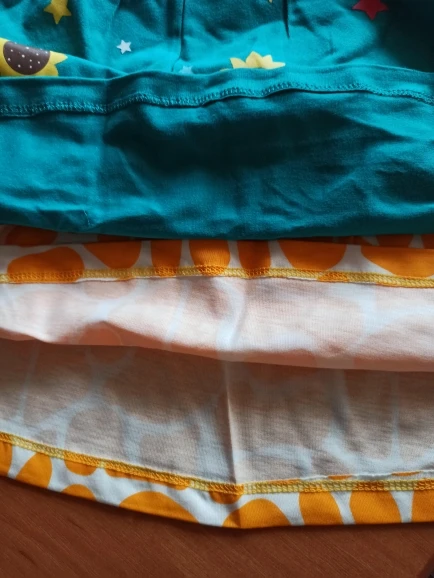 На рост Василисы 116см я взяла размер 7Т. Село замечательно - на лето как раз хватит. На таблицу продавца можно ориентироваться.В составе указан хлопок (95%). Думаю, так и есть. Ткань мягкая, приятная и неплохо тянется. Верхняя полочка белая, нижняя - вся цветная. Принт в виде попугая - рисунок на самой ткани.Пришлj в фирменном зип-пакете. Бирки и наклейки бренда присутствовали. Доставка в Беларусь 1,5мес.