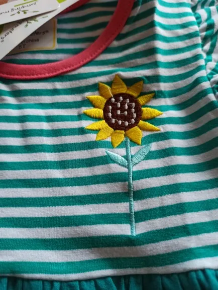 Это второе платье, которое я заказала в этом магазине и однозначно не последнее Качество платья как всегда прекрасное, тут и говорить не о чем. Подсолнух это вышивка, а на подоле печатный рисунок. С размером не стала рисковать и на наши 2.1 и рост 92 см, взяла размер 4т и правильно сделала. Сейчас село платье прекрасно и хватит надолго. Мне настолько нравятся платья этого бренда, что готова скупить их все