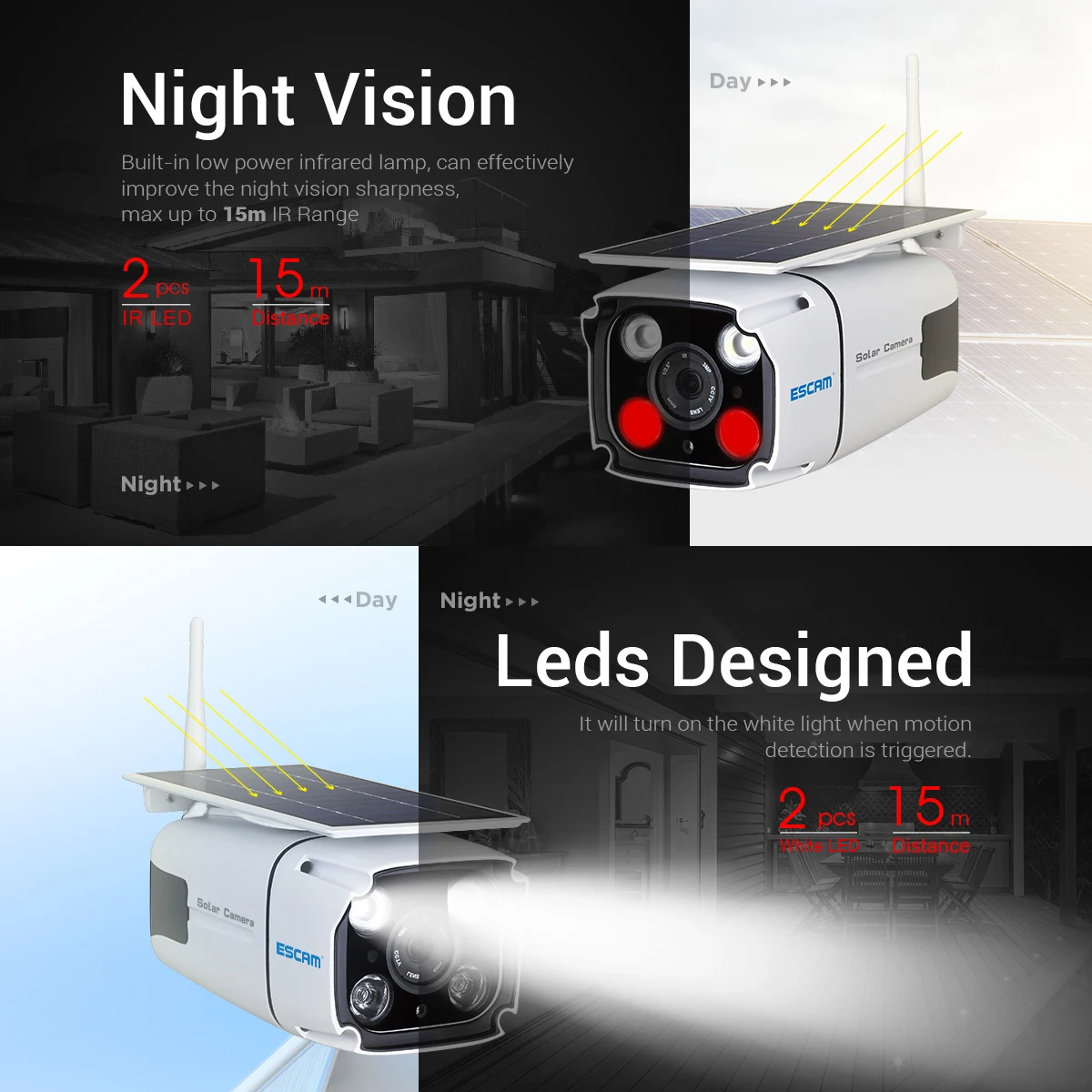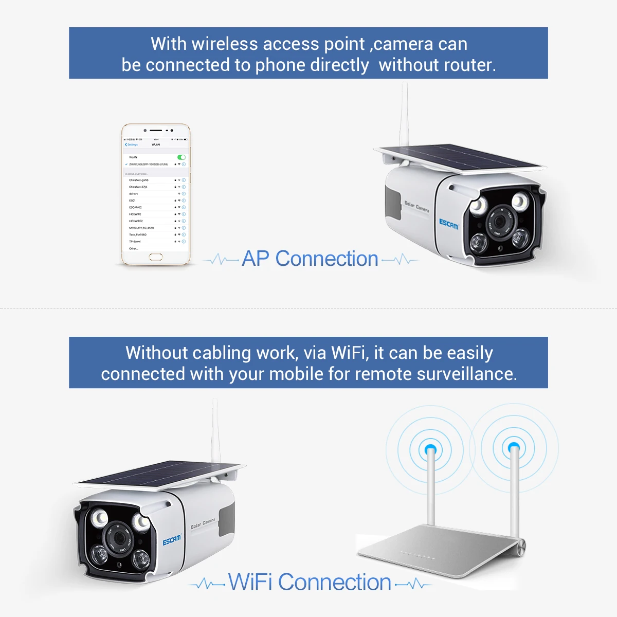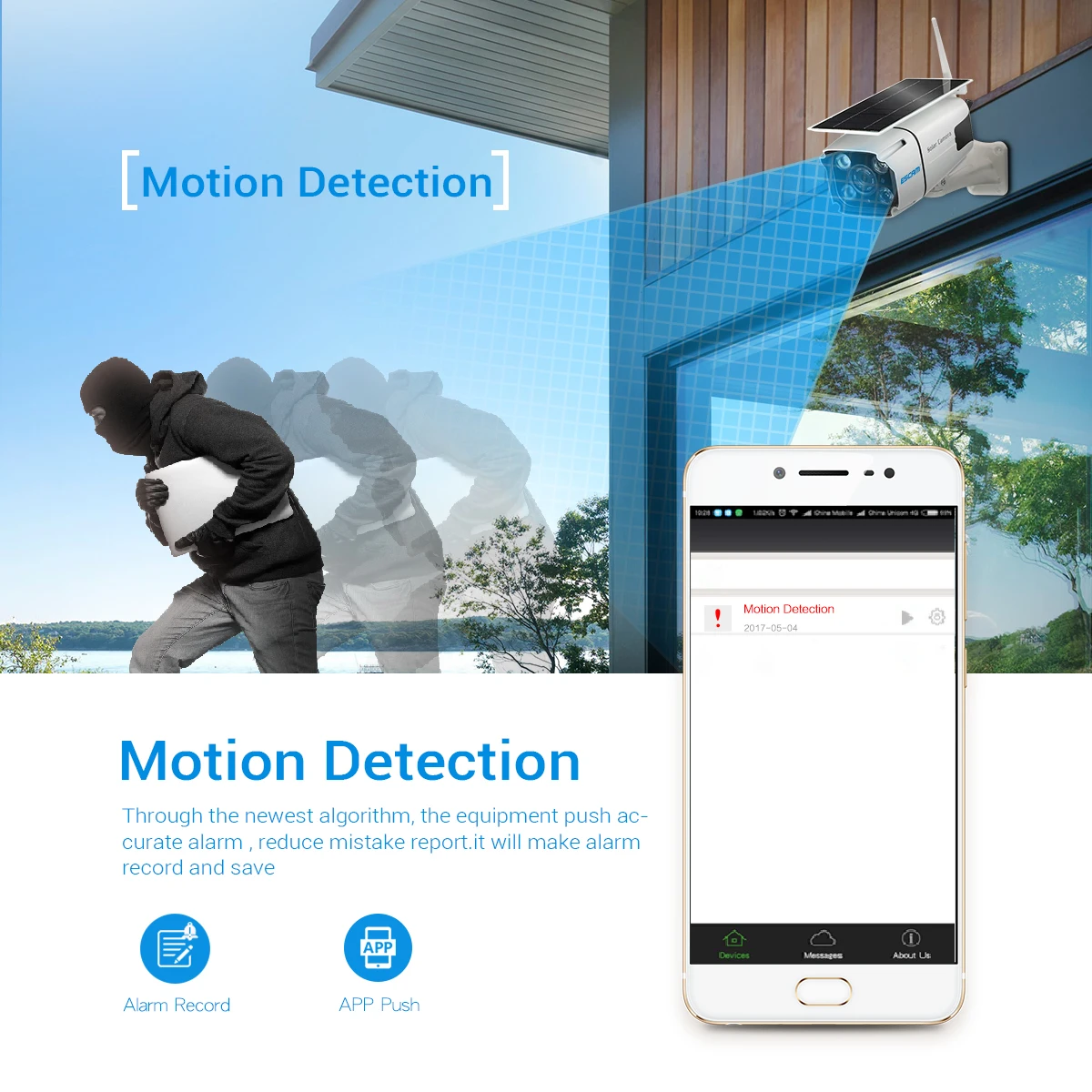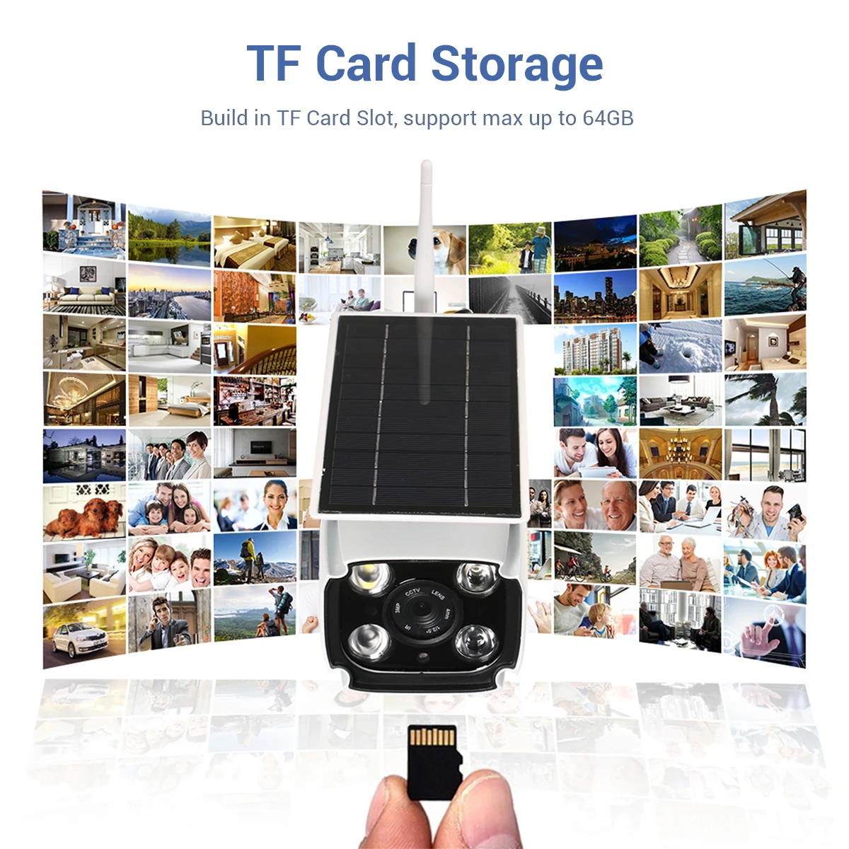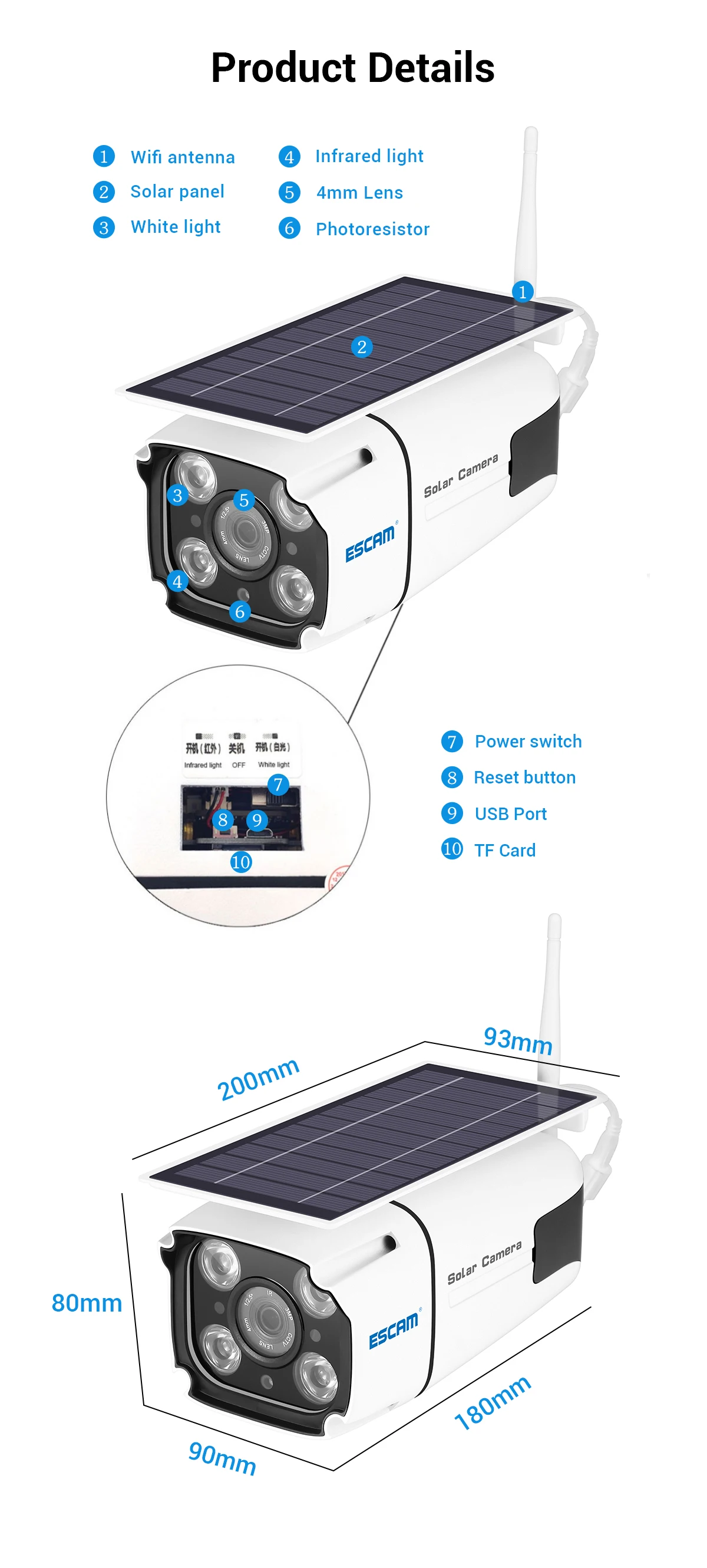 1. Не требуется электричество: питание от солнечной энергии и батареи;2. Нет необходимости в проводке: Нет необходимости в резьбе стены, долото отверстие или разрушить украшение;3. Поддержка автономных операций ed: контролируется без сети, поддерживает режим AP;4. Удаленный просмотр: Wi-Fi сеть может быть просмотрена удаленно;5. Индукция человека: Делайте фотографии сразу после индукции людей;6. Защита конфиденциальности: локальное хранение, отсутствие утечек;7. Индукционный уличный фонарь: чувствительный человек в ночное время, свет будет автоматически активирован;8. Простая установка: Самостоятельная установка, нет необходимости приглашать профессионального строительного персонала;9. Область применения: порог, двор, рыбный пруд, сад, ферма, шахта, строительная площадка и все места, где не удобно получать электропроводку.