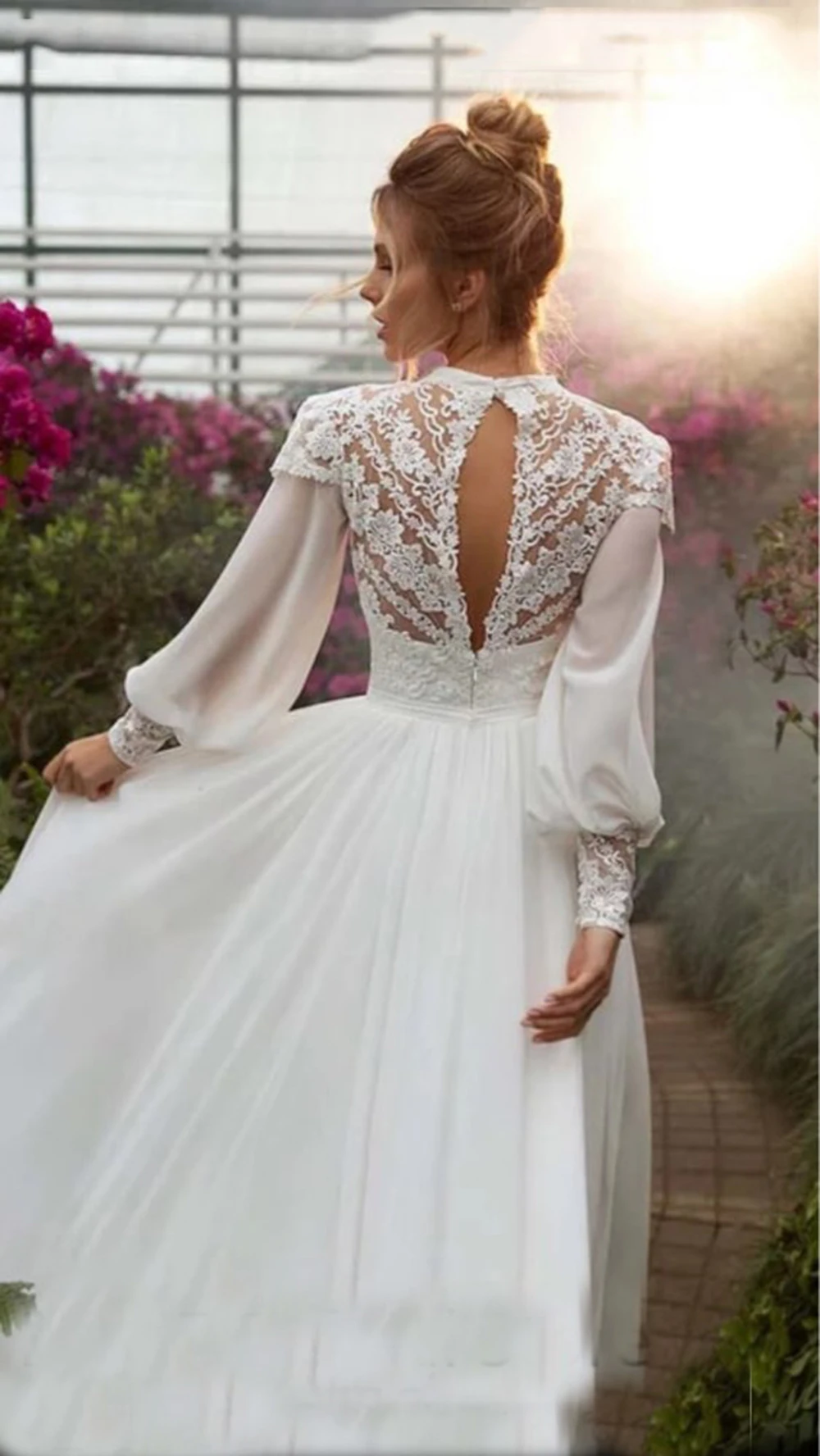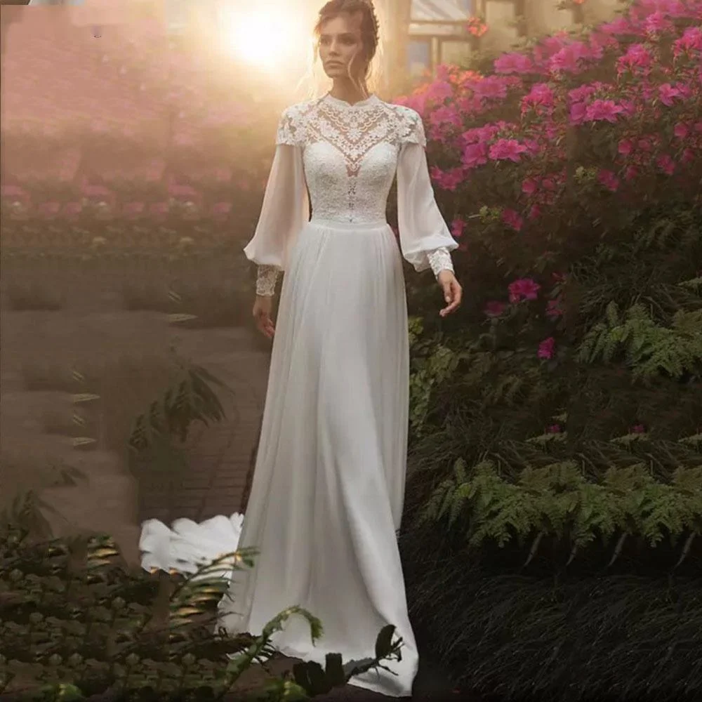 Пляжное шифоновое платье для невесты, кружевные свадебные наряды с аппликацией в стиле бохо, платья принцессы с длинным пышным рукавом для свадебной вечеринки на заказ