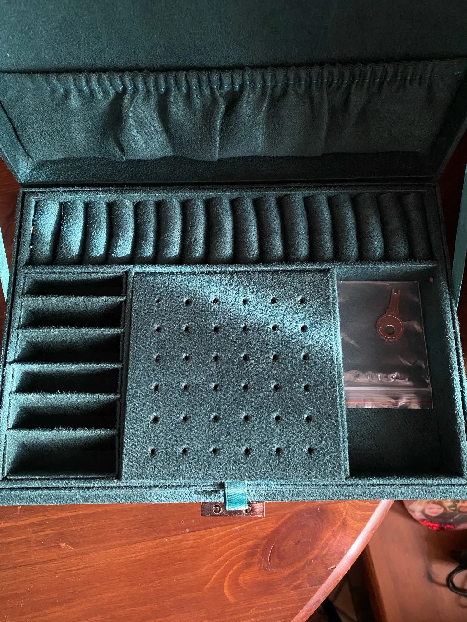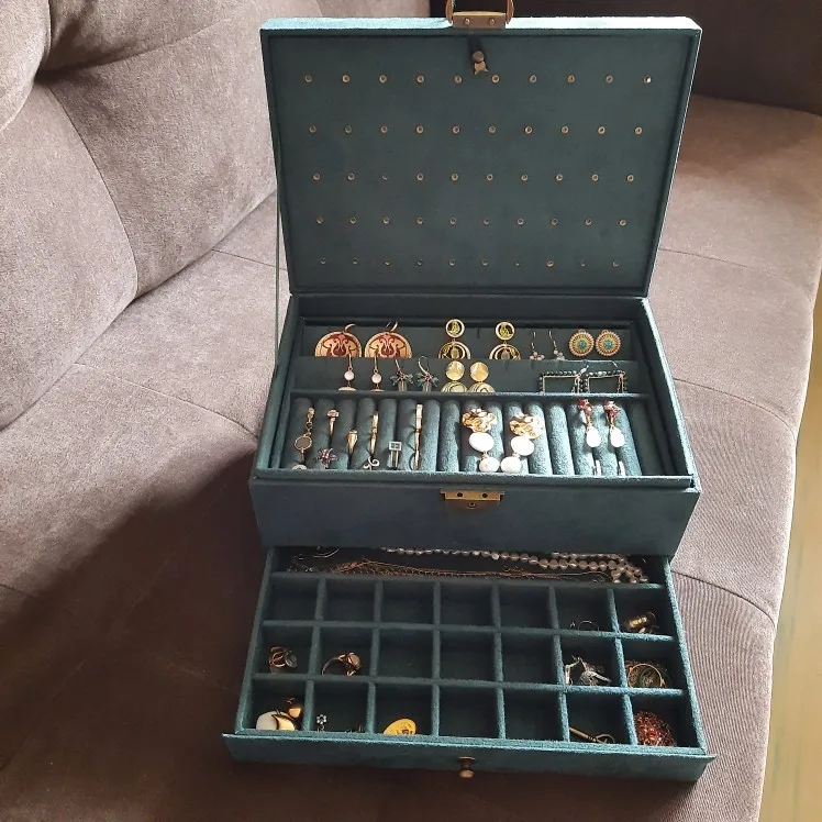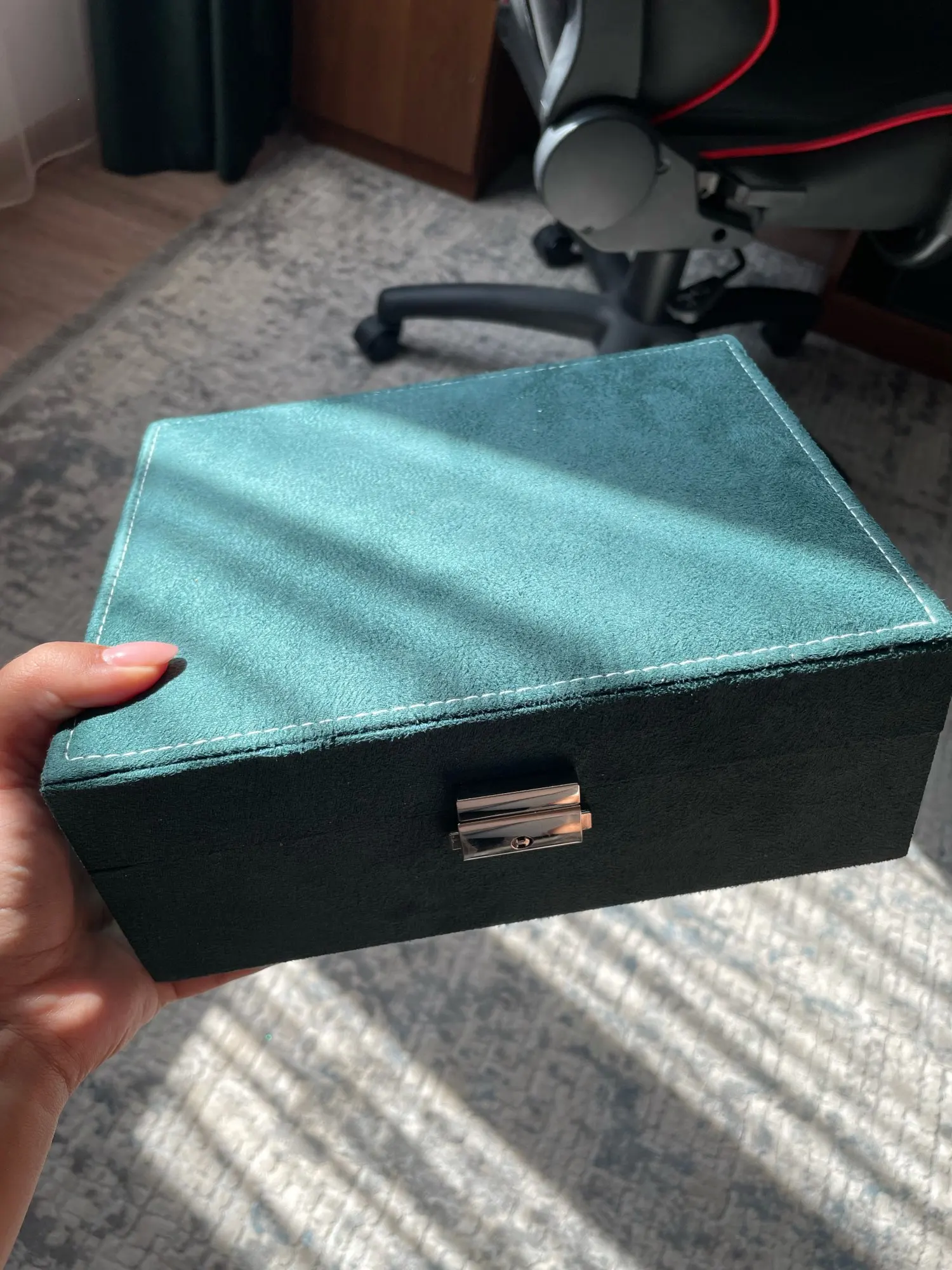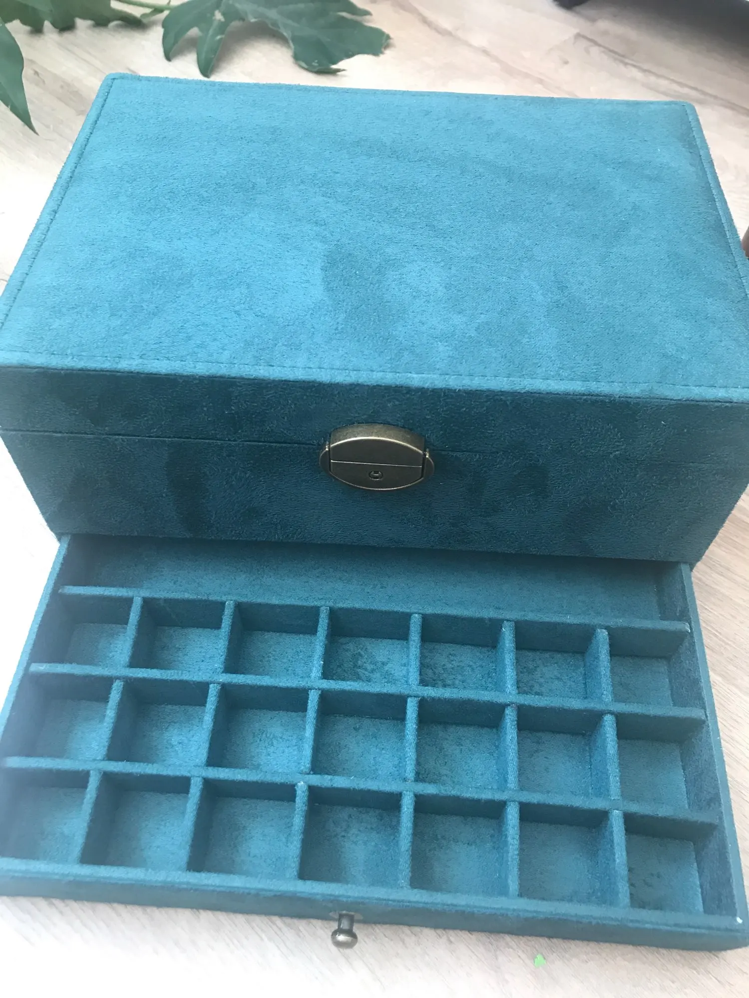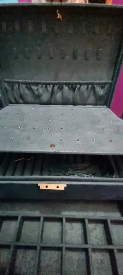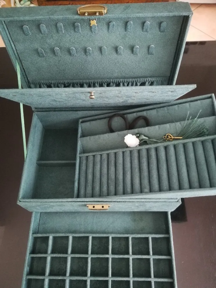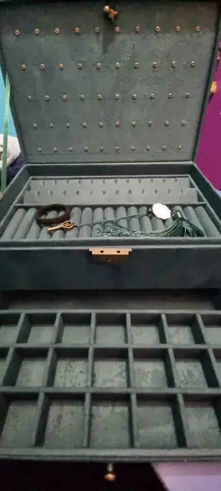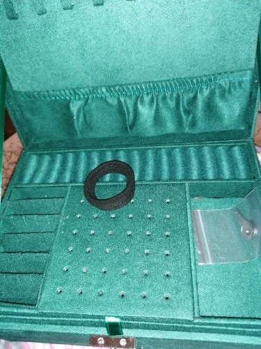 Коробка для ювелирных изделий поставляется в течение 5 дней, доставка и упаковка dell очень точное отслеживание. Внутри точно так же, как описано, я нашла даже ключ и две резинки для волос в подарок. Нижний ящик полностью отстегивается.