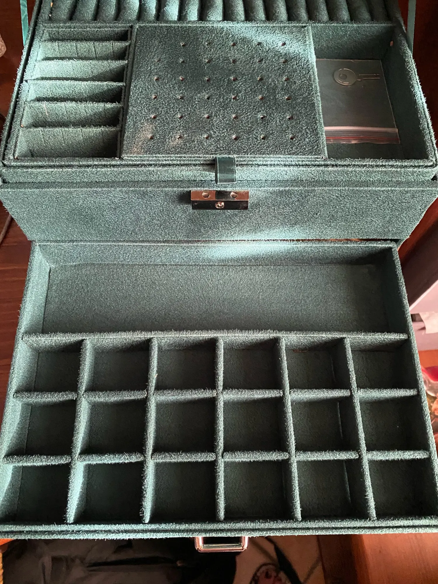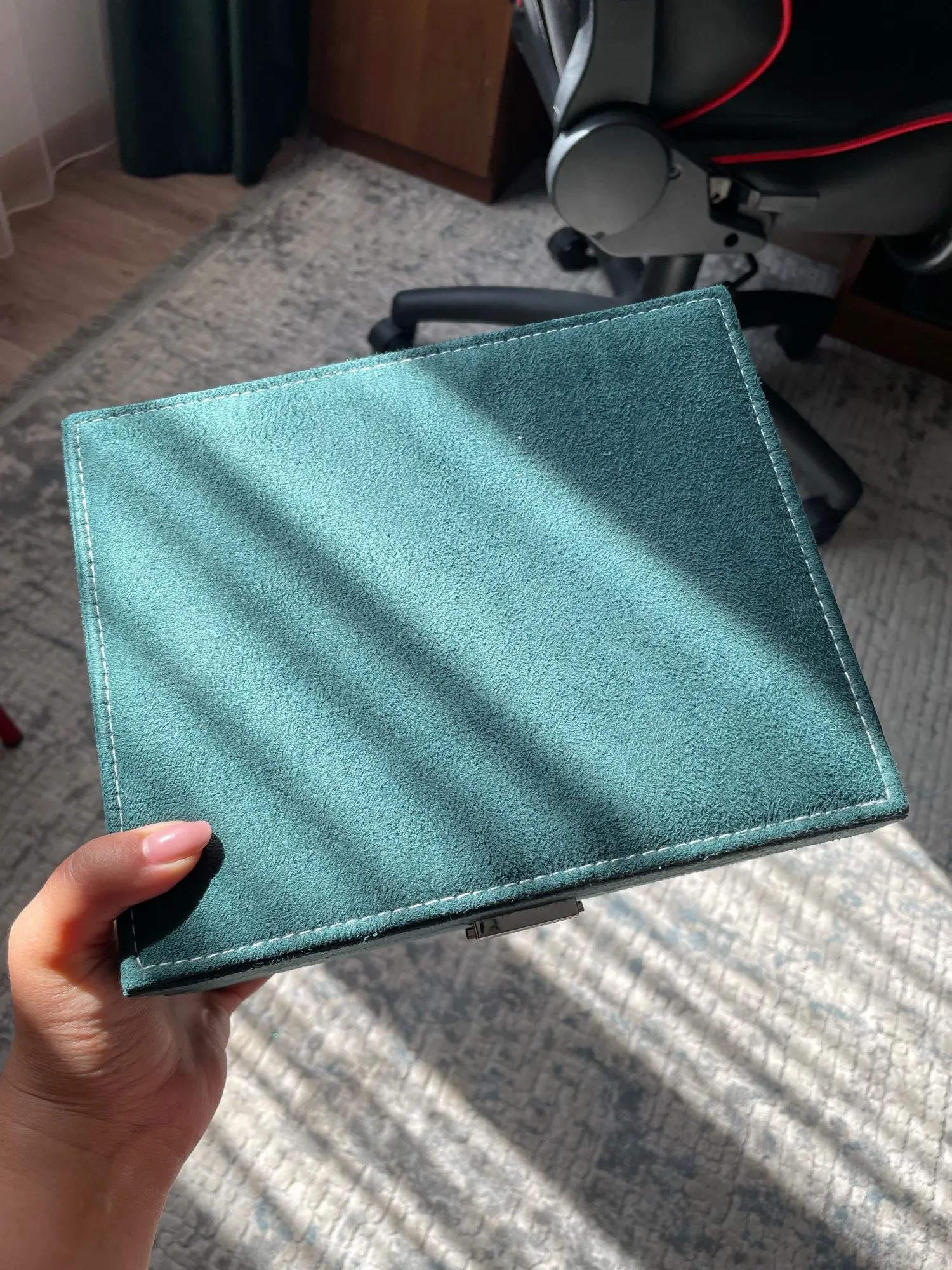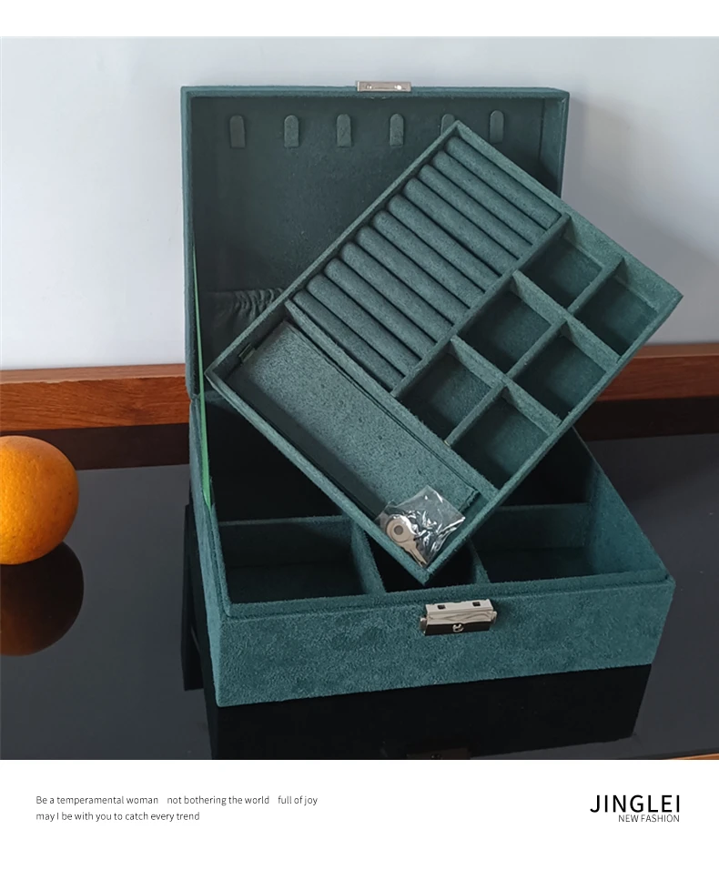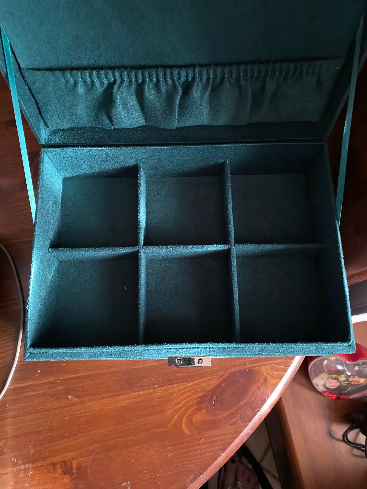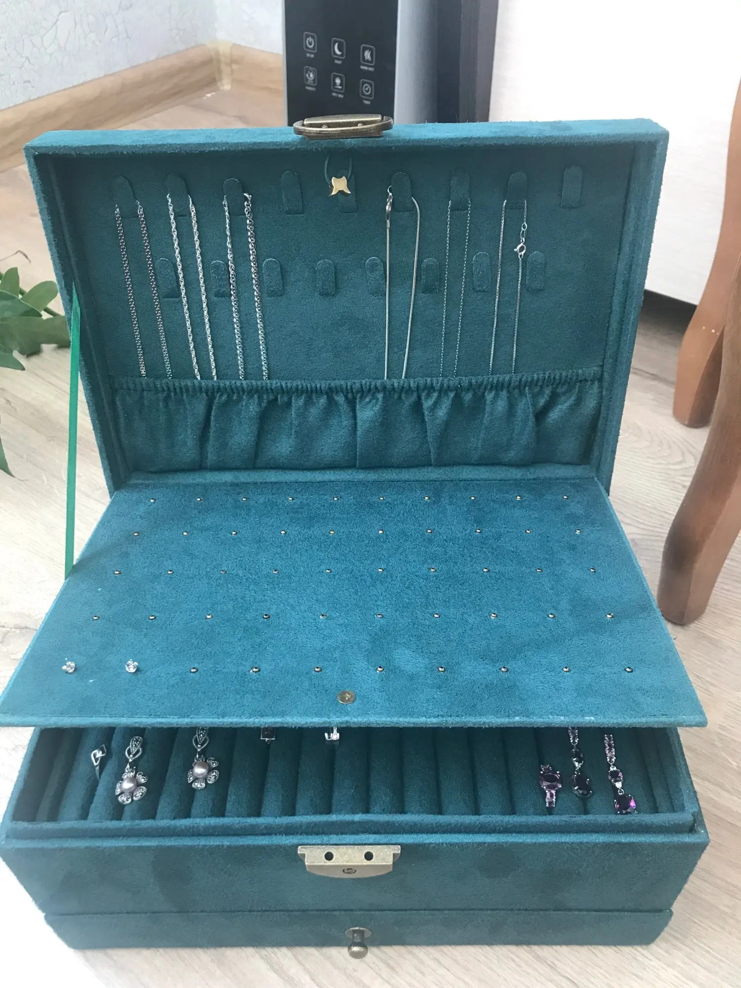 Коробка для ювелирных изделий поставляется в течение 5 дней, доставка и упаковка dell очень точное отслеживание. Внутри точно так же, как описано, я нашла даже ключ и две резинки для волос в подарок. Нижний ящик полностью отстегивается.