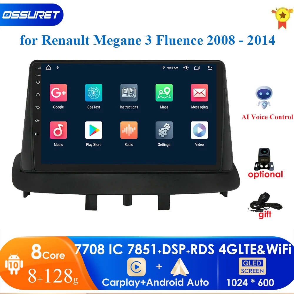 Автомагнитола на Android 10, мультимедийный плеер для Renault Megane 3 Fluence 2008-2014 с 4G, Wi-Fi, SWC, OBD, Carplay, 2 Din, без DVD, радио, ПК