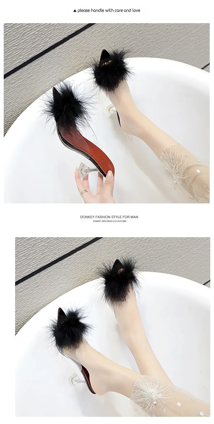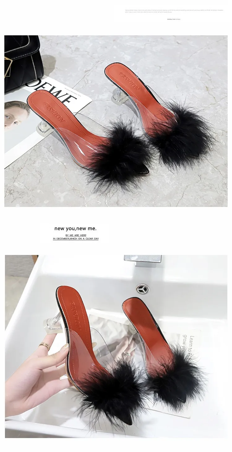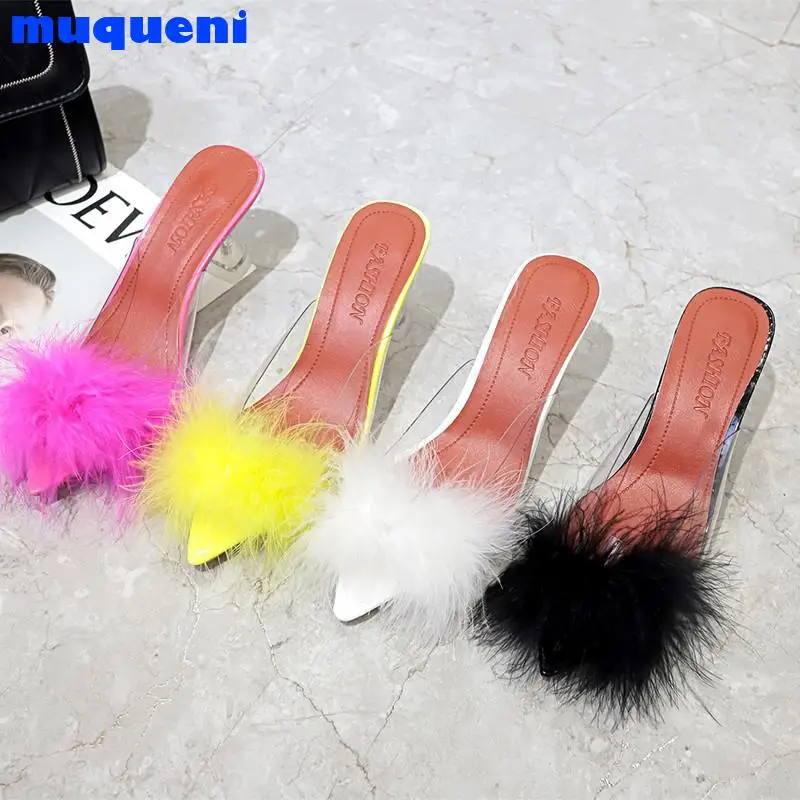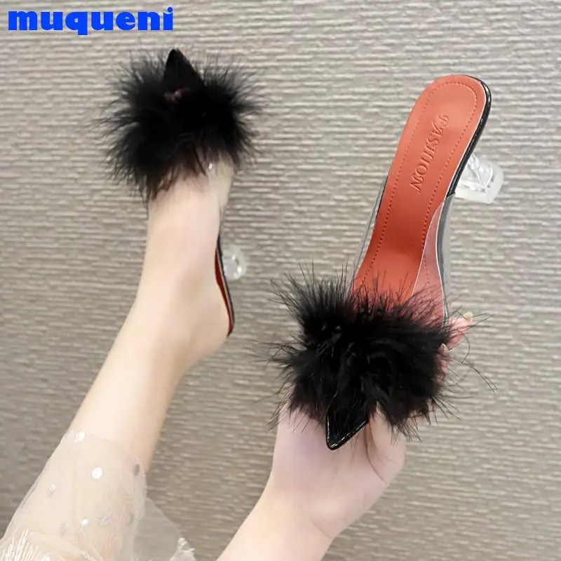 Женские туфли-лодочки MUQUENI, летние прозрачные туфли из ПВХ с перьями и кристаллами на высоком каблуке, женские шлепанцы из искусственного меха