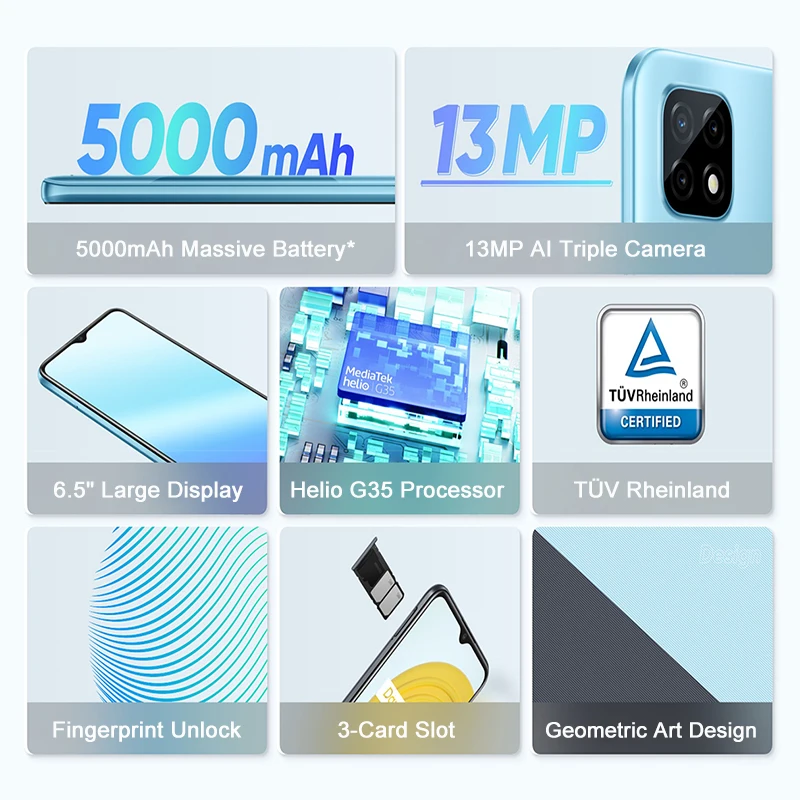 Дисплей 6,52 "HD + Waterdrop | Процессор Helio G35 | Аккумулятор 5000 мАч | Тройная камера 13 МП + 2 Мп + 2 МП | Поддержка обратной зарядки
