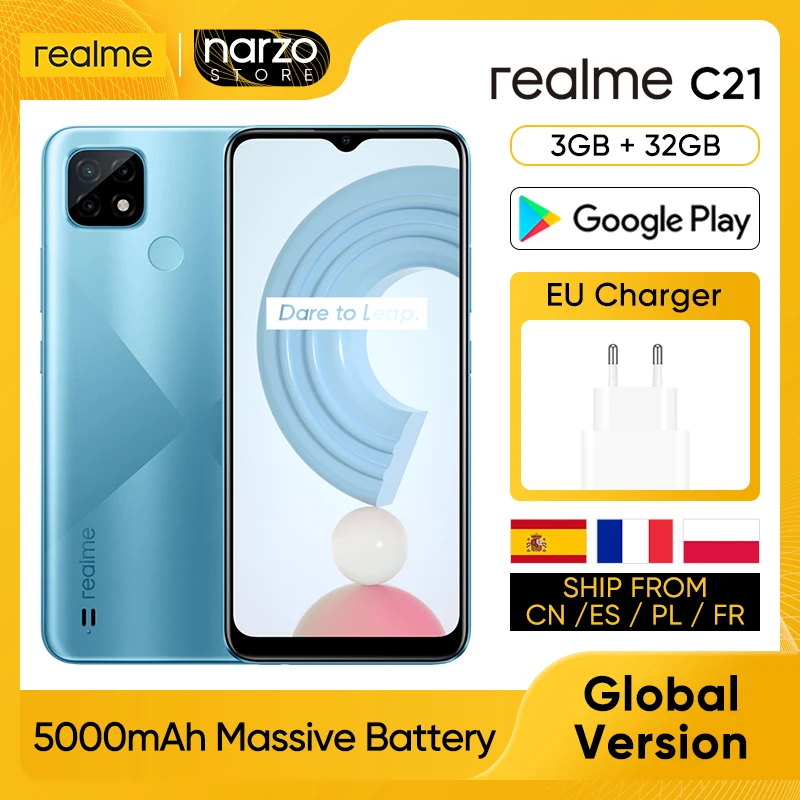 Realme C21 RMX3201 Мобильный телефон Глобальная версия 3GB RAM 32GB ROM MTK Helio G35 6,5'' ЖК-экран 13MP AI тройная камера Аккумулятор 5000 мАч