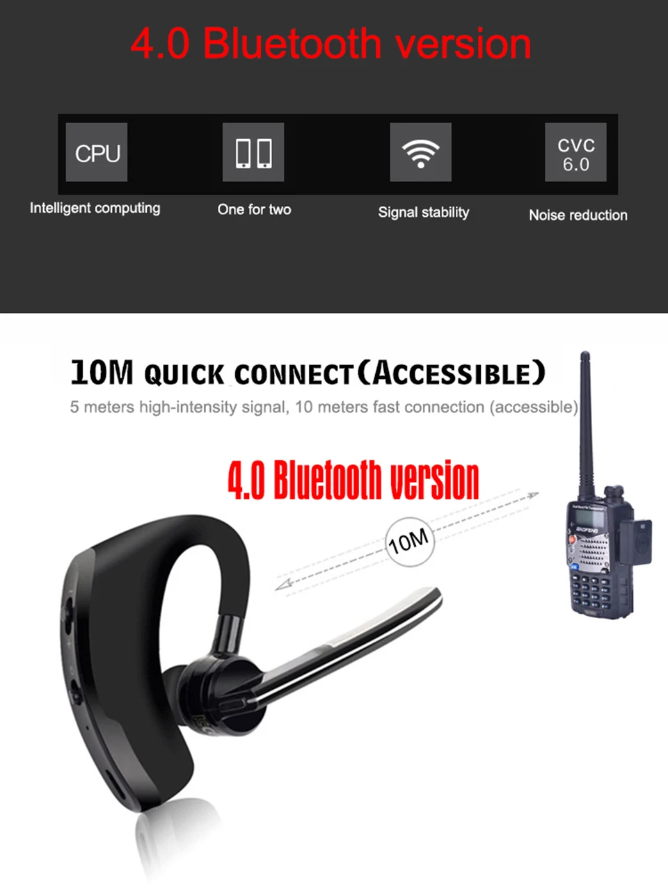 HB-6A свободные руки, включая HB-6A Bluetooth Донгл и Bluetooth наушник V4.0. V4.0 является поворотным наушником, который встроен в PTT микрофон, который может быть помещен над любым ухом.Наушник обеспечивает наилучшее качество звука в сочетании с HB-6B разъемом двухсторонней радиостанции и достаточно удобен и гибкий для повседневного ношения. Не стесняйтесь работать с ним, чтобы освободиться от рук в работе. Модель: bluetooth-гарнитура HB-6A(Bluetooth Донгл HB-6A + bluetooth наушник V4.0)Версия BluetoothV4.0 класс 2Частотный диапазон2,4GРабочий режимHFP1.5 A2DP AVRCPВремя зарядки1-2,5 HДиапазон разговоров<10 метровВремя работы5-8HoursВремя в режиме ожидания<100 часовСоединительСтандарт K1РазмерыHB-6A: 3,6*2,5*3,6 смHB-6B: 3,3*2,5*1,5 смВес100 г