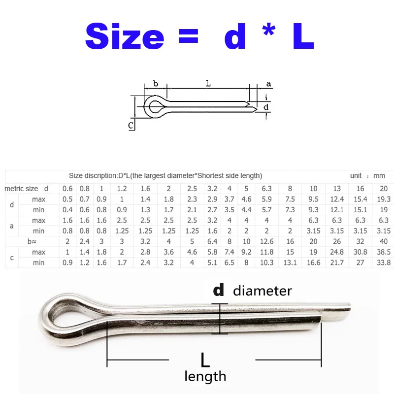 Материал: нержавеющая сталь 304 (A2-70)Диаметр стержня:1/1,2/1,5/2/2,5/3/3,2/4 / 5 / 6/6,3/8 / 10 мм (M1-M10)Длина:8 / 10 / 12 / 16 / 20/ 25 / 30/ 35 / 40 / 45 / 50 / 60 / 70 / 80 / 90 / 100 ммРазмер = D (диаметр) * L (длина) обратите внимание, что длина-это более короткая сторона, смотрите ниже картинку внимательно