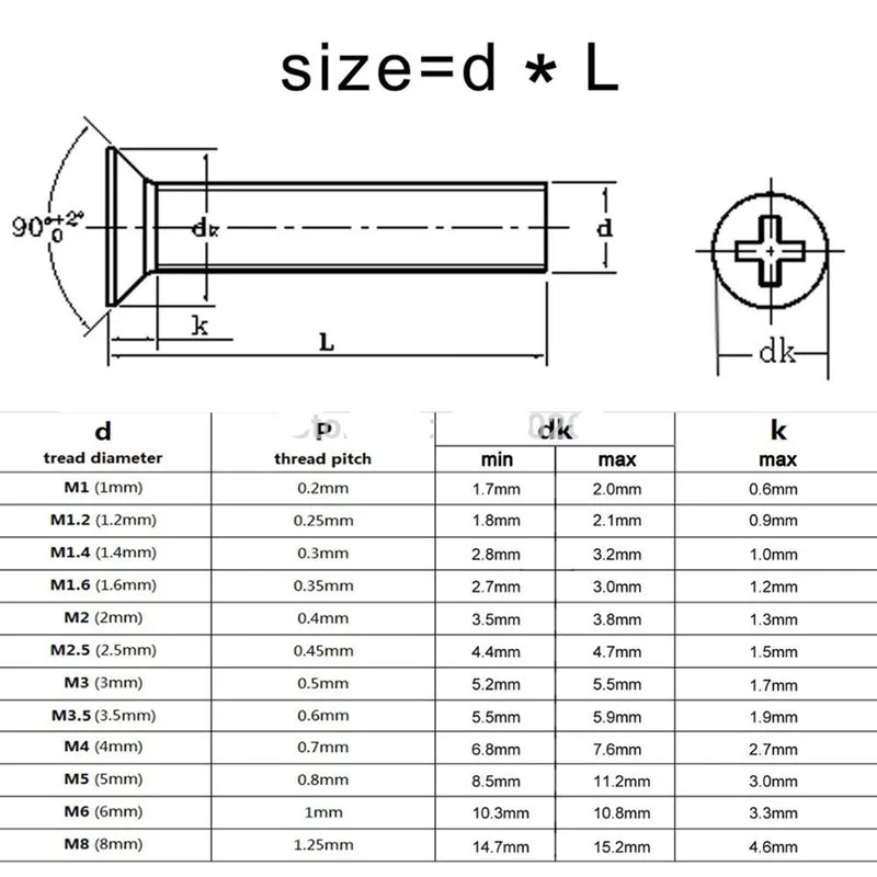 0,4 мм (M2)/0,45 мм (M2.5)/0,5 мм (M3)/0,6 мм (M3.5)