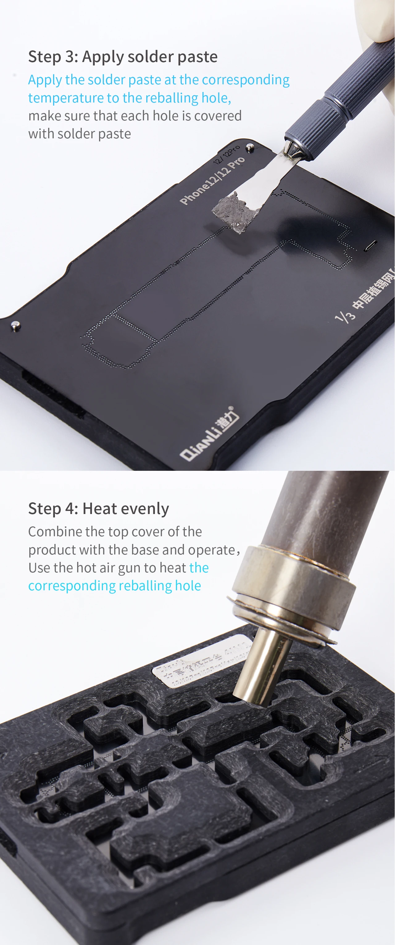 Особенность: 1. Поддержка iPhone 12/12 Pro/12 Pro MAX/12 Mini. 2. Позиционирование основной платы стабильное, посадка олова не будет соскальзывать. 3. Магнитный выдвижной дизайн, быстро и удобно. 4. Изготовлен из импортной высококачественной стали, износостойкий. 5. Оловянный шар круглый и пухлый. 6. Высокотемпературный магнит сильно прижимается, чтобы эффективно предотвратить выпуклость стальной сетки из-за высокой температуры Посылка: 1 * платформа для реболлинга BGA 3 * черный трафарет