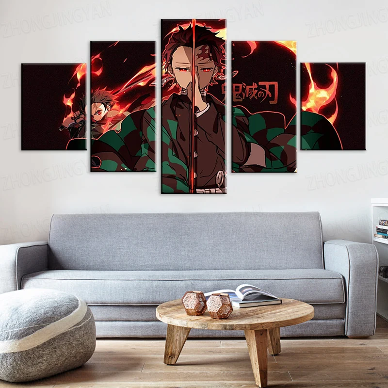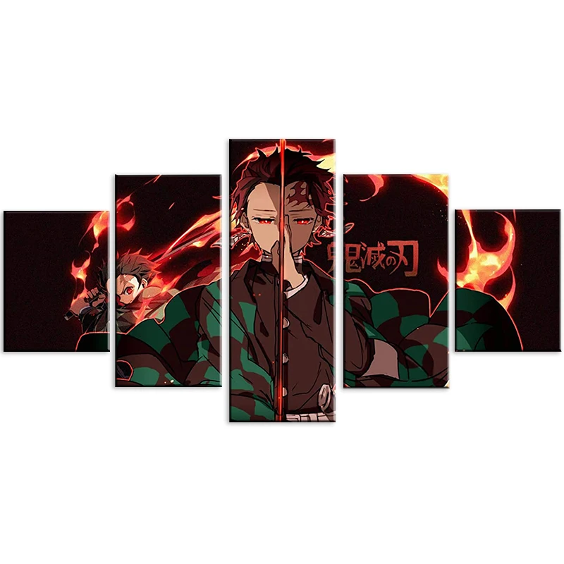 Постеры на холсте с изображением рассекающего демонов киметсу no Yaiba, 5 панелей, аниме настенные художественные постеры Tanjirou для украшения гостиной, спальни