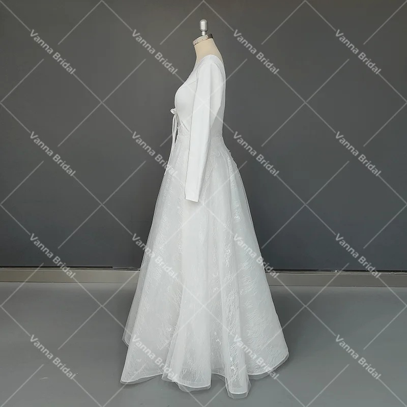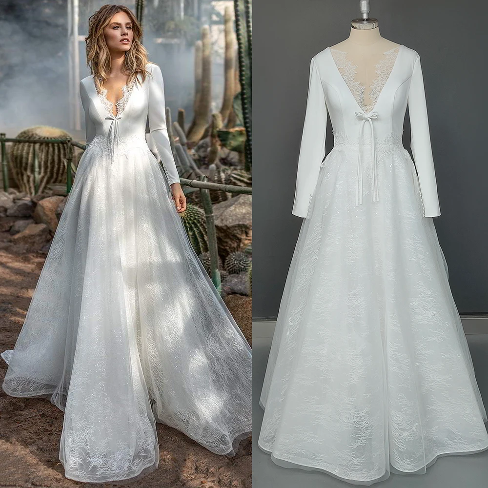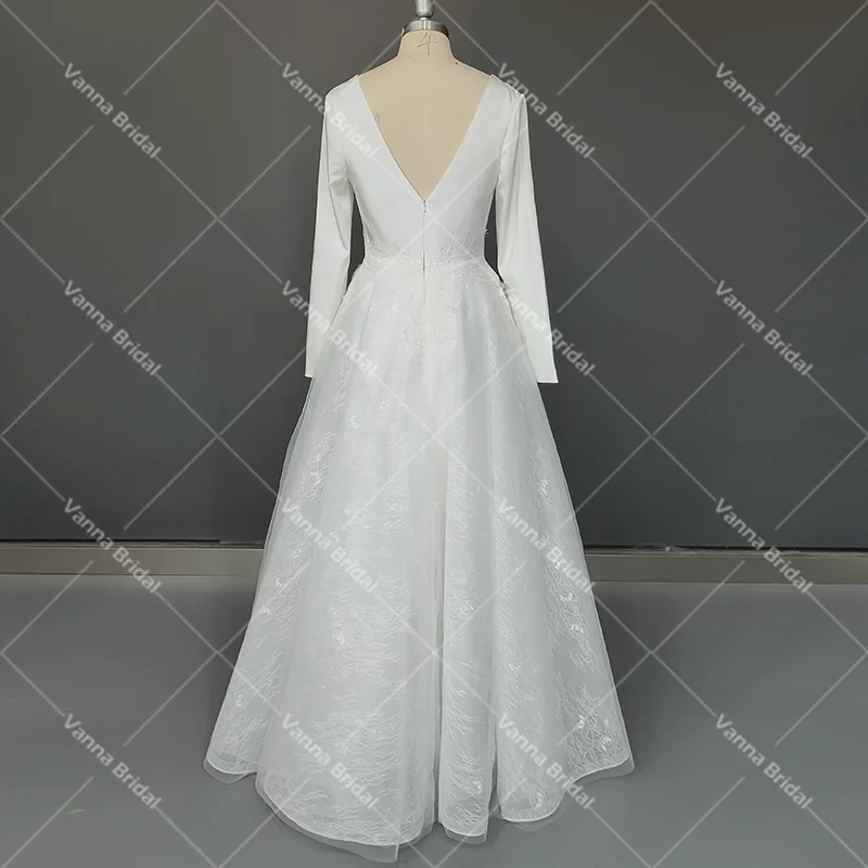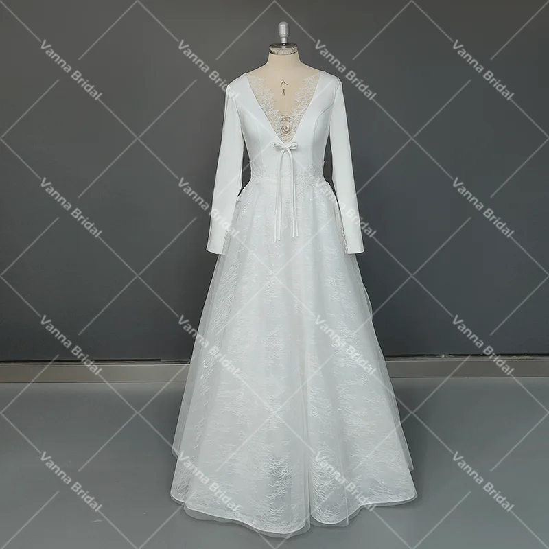 Реальные фотографии, атласные с длинным рукавом, стиль кантри, v-образный вырез, винтажные элегантные кружева шантильи, с открытой спиной, Гламурные свадебные платья