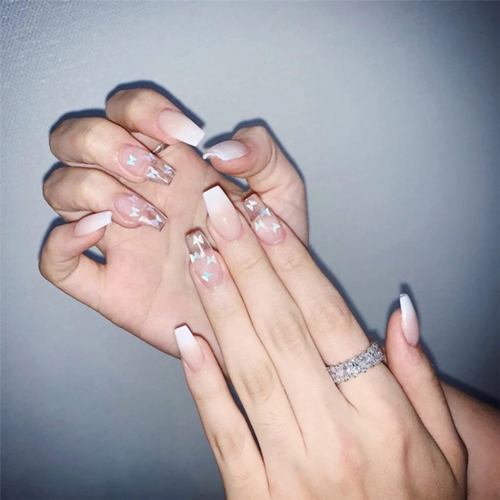 24 шт., накладные ногти с рисунком розовой бабочки, Длинные французские квадратные накладные ногти, прижимаются, полностью закрывают Типсы для маникюра, Декор
