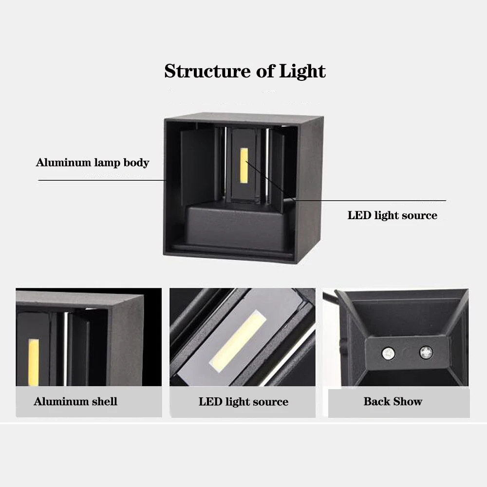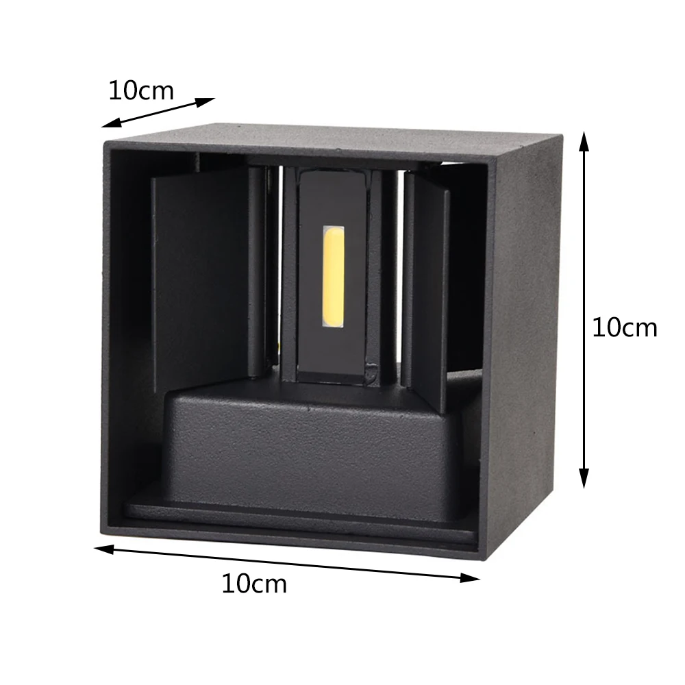 Современный минималистичный кубический дизайн, светящийся вверх и вниз, внутри есть две поворотные доски для регулировки диапазона облучения, максимальный угол луча до 100 градусов. После установки крышка лампы снимается, что позволяет удобно регулировать угол луча или регулярно чистить его. 12 Вт 7 Вт COB светодиодный настенный светильник, отличные водонепроницаемые свойства ip65. Материал: литой под давлением алюминиевый сплав. Низкое энергопотребление, чрезвычайно долгий срок службы более 50000 часов. Простота установки, удобство использования. Используется для домашнее освещение, фон для телевизора, спальня, Ресторан, Бар, кафе, отель, пейзаж и т. д. широко используется в внутреннем и наружном освещении и украшении.