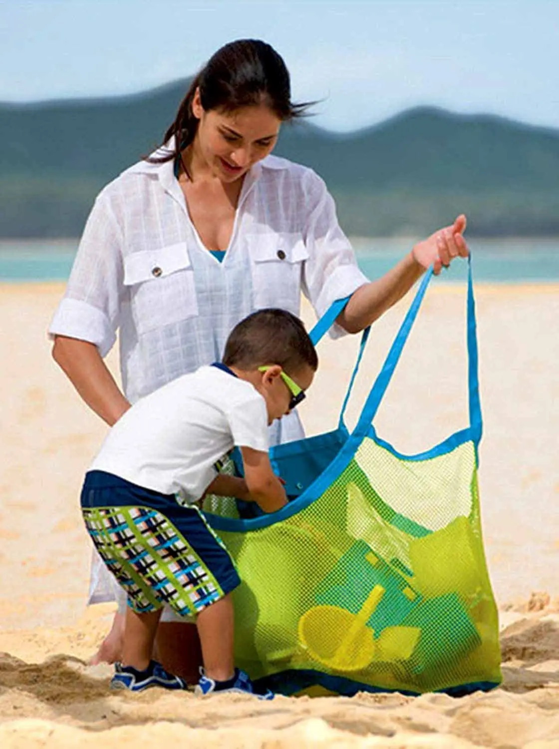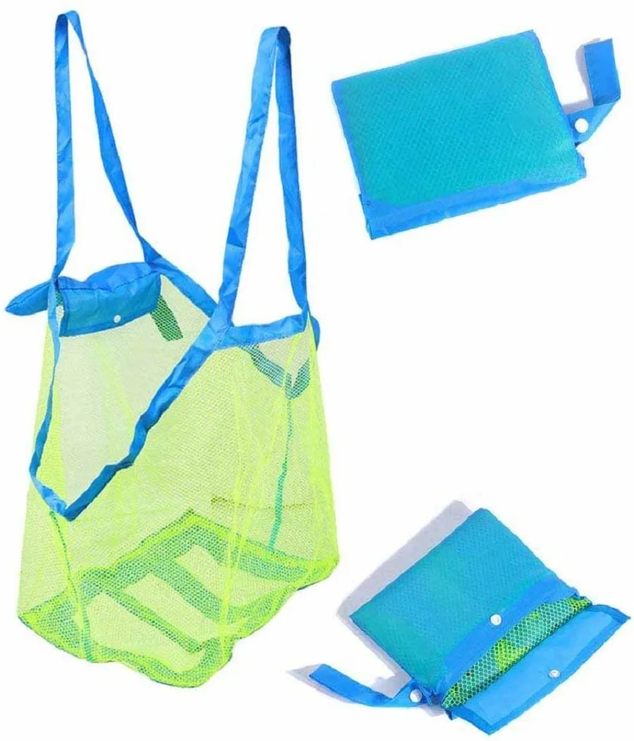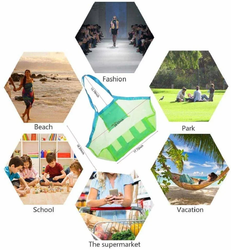 Широкий диапазон применения --- эта сетчатая пляжная сумка подходит для пляжей, бассейнов, аквапарков и т. д. Дети могут собирать ракушки, детские пляжные игрушки и все, что они выбирают на пляже, в сетчатой пляжной сумке.