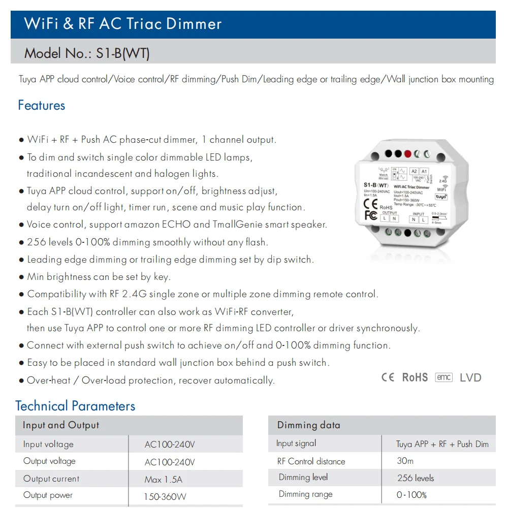 ● Wi-Fi + RF + пуш-ап диммер с Отсечкой фазы для сети пер. тока, 1 выходной канал.● Затемнять и включать одноцветные затемнения светодиодный лампы, традиционные лампы накаливания и галогенные лампы.● Облачное управление Tuya APP, поддержка включения/выключения, регулировка яркости, Задержка включения/выключения светильник, таймер, функция воспроизведения сцены и музыки.● Voicecontrol, supportamazonECHOandTmallGeniesmartspeaker.● 256levels0-100% dimmingsmooth withanyflight.● Затемнение передних кромок или затемнение задних кромок устанавливается переключателем dip.● Минимальная яркость может быть установлена ключом.● Совместимость с нашим дистанционным управлением RF 2,4G с одной зоной или несколькими зонами затемнения.● Каждый S1-B(WT) контроллер также может работать в качестве WiFi-RF преобразователя, а затем использовать приложение Tuya для управления одним или несколькими светодиодный контроллер RF затемнения или драйвер синхронно.● Подключение к внешнему кнопочному переключателю для обеспечения включения/выключения и 0-100% функции затемнения.● Легко помещается в стандартную настенную распределительную коробку позади кнопочного выключателя.● Защита от перегрева/перегрузки, восстановление автоматически.