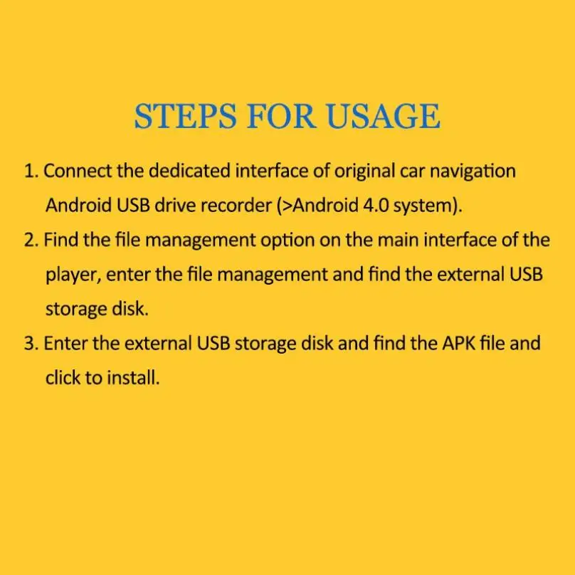 Особенности:Поддержка автоматического включения для запуска записи видео после запуска автомобиляПоддержка циклической записиВстроенный файл APK для установки мобильного соединения автомобиляСистема: для Android 4,0 выше большой экран навигатораПоддержка автомобильного и мобильного соединения, подключение приложения.ПараметрыУгол поворота объектива: Поддержка ручного поворота вверх и вниз на 60 °Внешнее хранилище: Поддержка TF 8G ~ 32G (не входит в комплект)Фиксированный способ: двусторонний скотчФормат кодирования видео: MOVРазрешение видео: 1080PШирокоугольный объектив: 170 °Частота видеокадров: 30 кадров в секундуПосылка входит1 x Автомобильный видеорегистратор1 шнур питания USB1 x Руководство пользователя