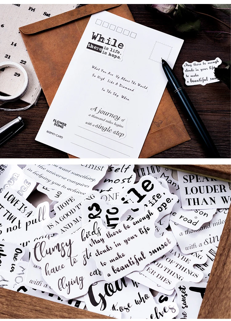 Наклейки выглядят очень красиво, чтобы перевести их на русский ушло полтора дня, но это того стоило. есть 2 фразы которые повторяются но в двух разных шрифтах. Есть глянец. Претензий к доставке не имею, заказывала ещё с товарами этого магазина положили всё в один пакет.