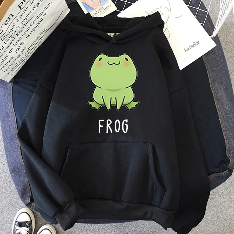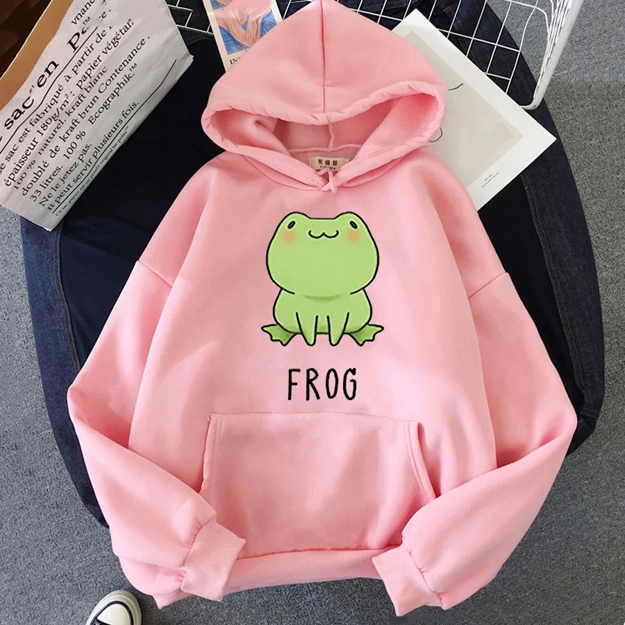 Толстовка Оверсайз с капюшоном и принтом лягушки в стиле унисекс, повседневный базовый милый студенческий пуловер, пальто