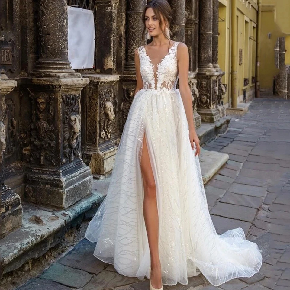 Платье принцессы с блестками на свадьбу, платья с разрезом сбоку пикантные V образным вырезом с кружевной аппликацией свадебное платье в стиле бохо платье трапециевидной формы Vestido De Novia Свадебные платья