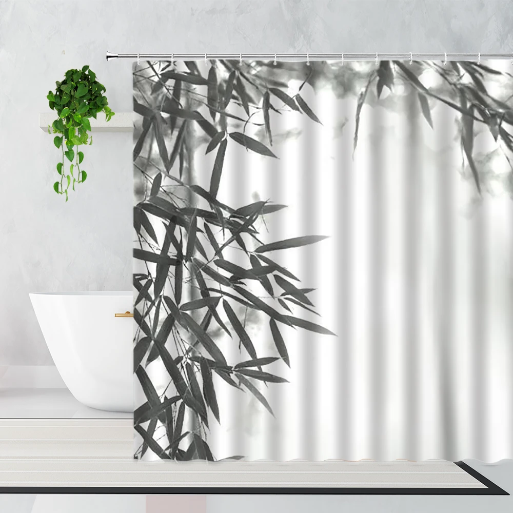 Zen занавеска для душа, зеленые растения, бамбуковые листья, галька...