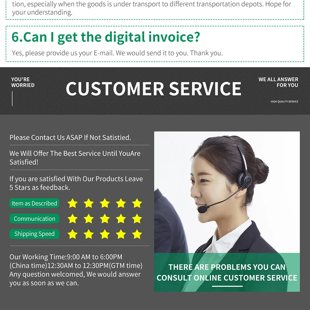 1. Ваше удовлетворение и положительные отзывы очень важны для нас. 2. Пожалуйста, оставьте положительные отзывы и 5 звезд, если вы удовлетворены нашими товарами и услугами. 3. Пожалуйста, свяжитесь с нами немедленно, прежде чем дать нам нейтральные или отрицательные отзывы, чтобы мы могли удовлетворительно решить ваши проблемы.