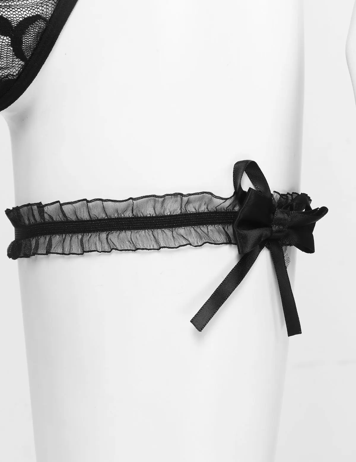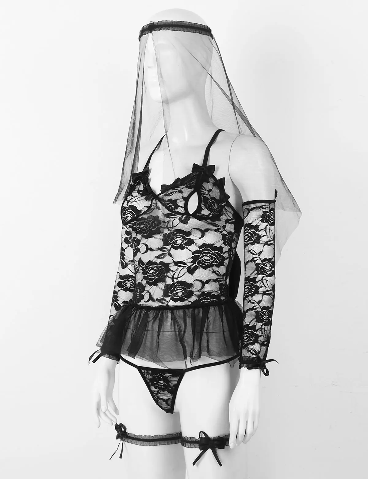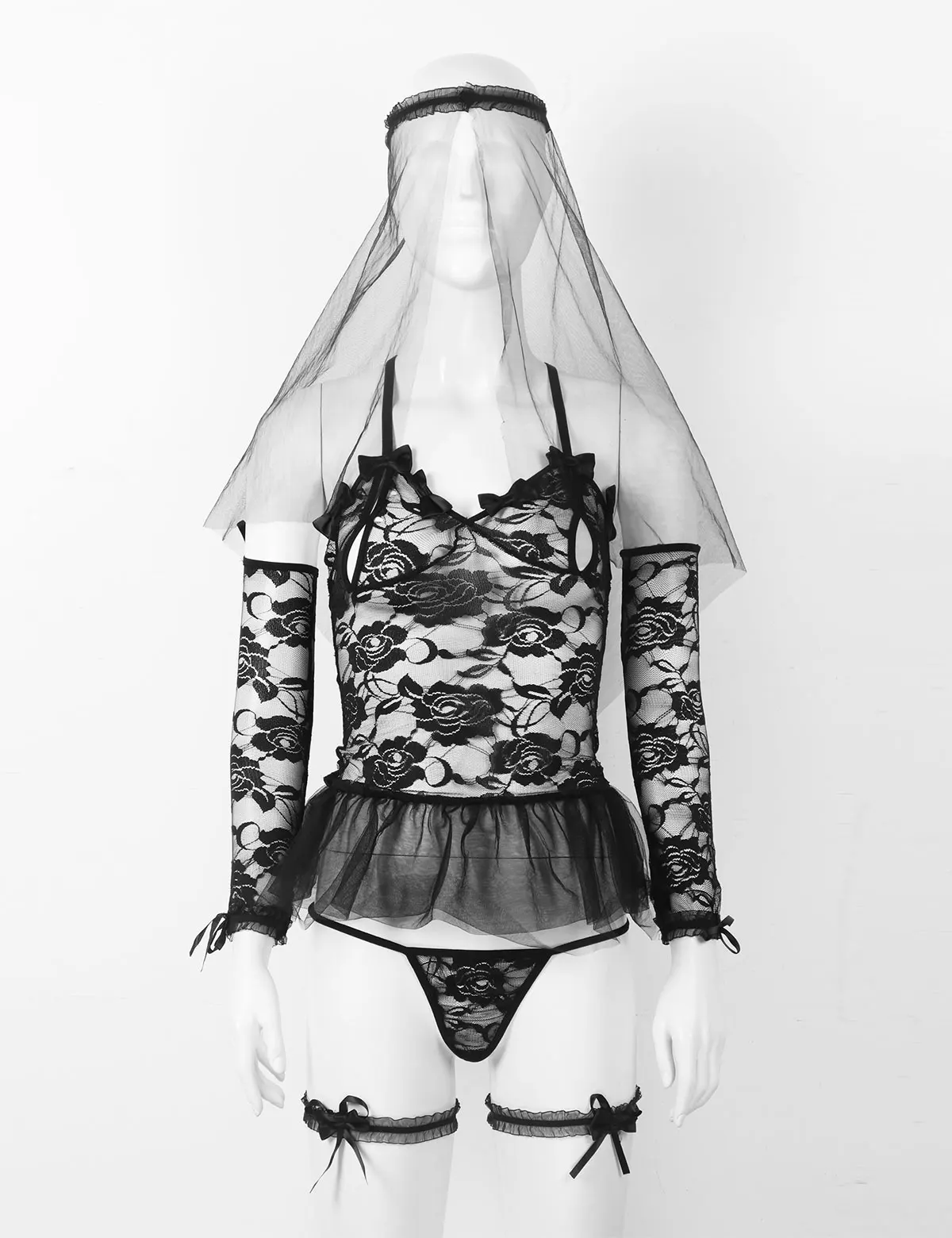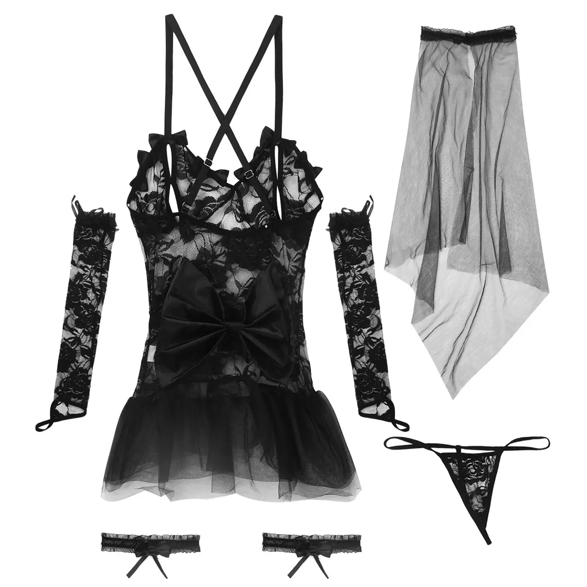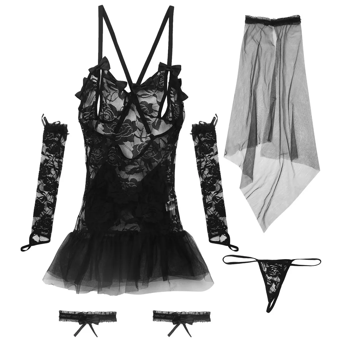 5 шт., женское нижнее белье, кружевной сетчатый костюм невесты для ролевых игр, набор с Babydoll, головной убор, перчатки, стринги, подвязки для ног