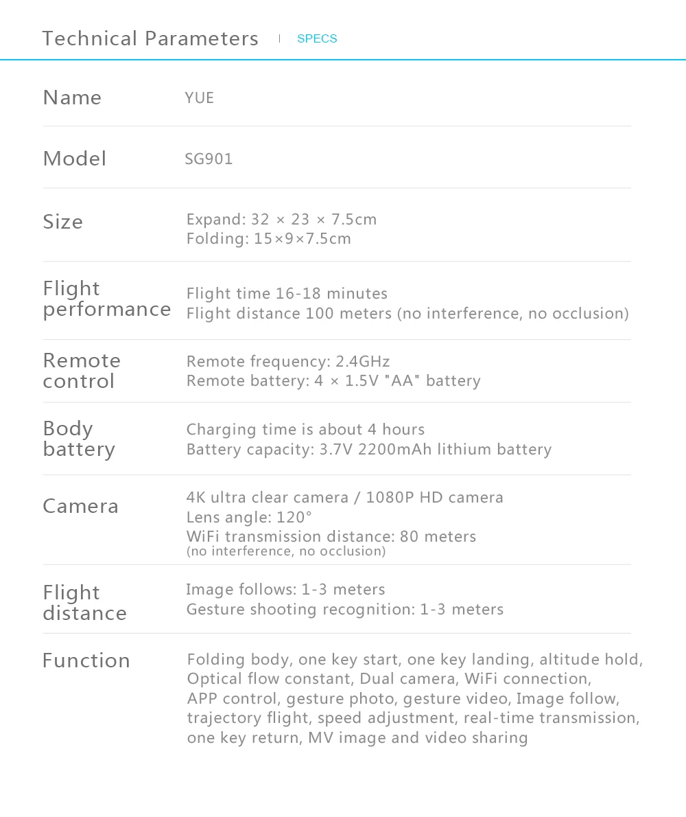 SG907MAX-полное обновлениеSG907 PRO: 2-осевой стабилизатор с защитой от сотрясенияSG907 MAX: 3-осевой стабилизатор с защитой от дрожания UHD + EISSG907 PRO: Обычный двигательSG907 Макс: бесщеточный двигатель 1860SG907 PRO: аккумулятор 7,6 В, 1600 мАч, время полета 15 минутSG907 Макс.: аккумулятор 7,6 В, 2600 мАч, время полета 25 минутSG907 PRO: Полетный вес составляет около 285 гSG907 Макс: Полетный вес составляет около 310 гСвойства камерыПиксели изображения фронтальной камеры:4096PX3072P (TF)4096PX3072P (приложение)Передняя камера видео пиксель:2048PX1080P (TF)2048PX1080P (приложение)Пиксели изображения нижней камеры: 1280P X 720PПиксели для нижней камеры: 1280P X 720P