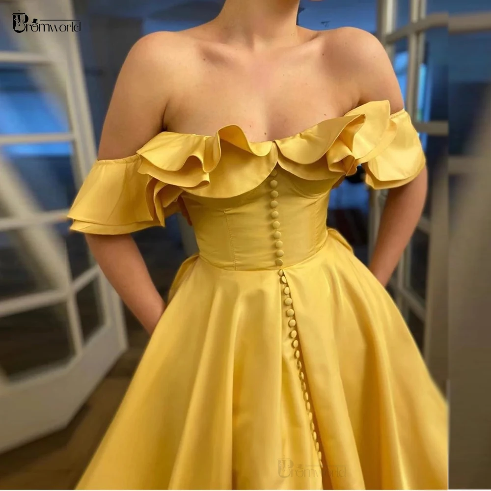 Вечерние платья-трапеции желтого цвета с открытыми плечами, Длинные атласные плиссированные Привлекательные вечерние платья на пуговицах с высоким разрезом
