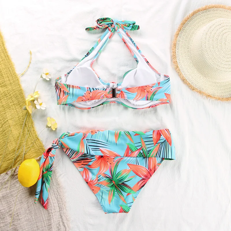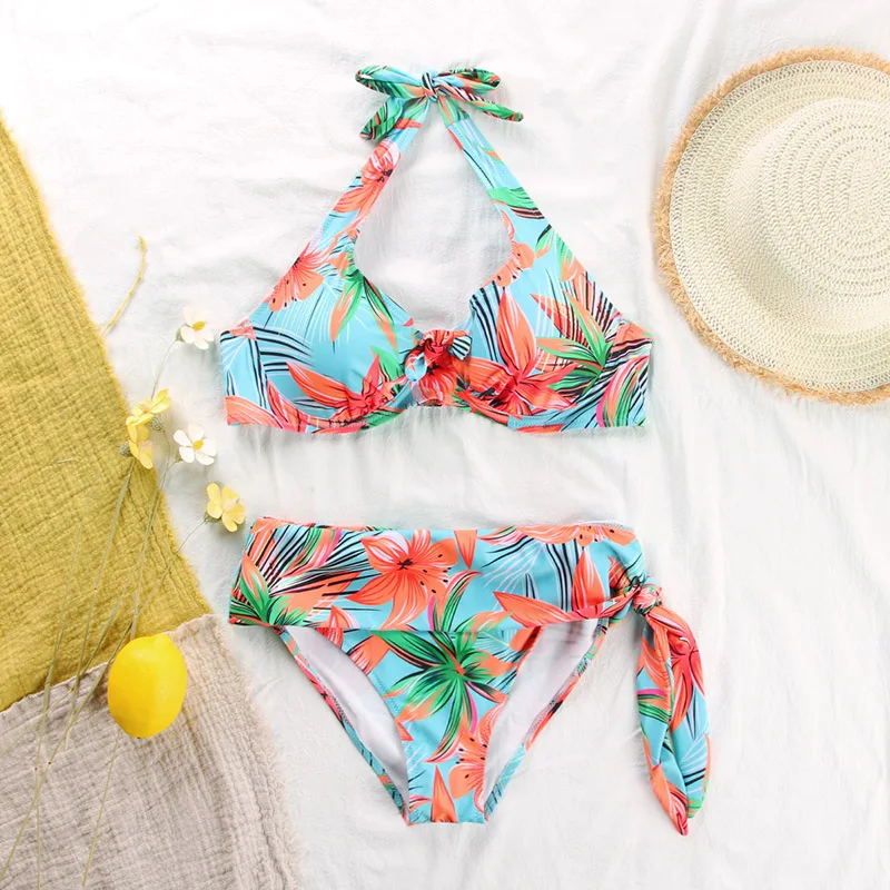 Купальник бандажный женский с высокой талией, пуш-ап, цветочный принт, бикини с поясом, 2021