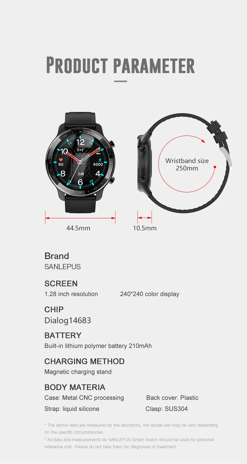 Бренд Санлепус Экран Цветной дисплей с разрешением 1,28 дюйма 240*240 Чип Диалог Батарея Встроенный литий-полимерный аккумулятор 210 мАч Способ зарядки Магнитная зарядная подставка Материал корпуса Чехол: обработка металла с ЧПУ Задняя крышка: пластик Ремешок: жидкий силикон Застежка: SUS304