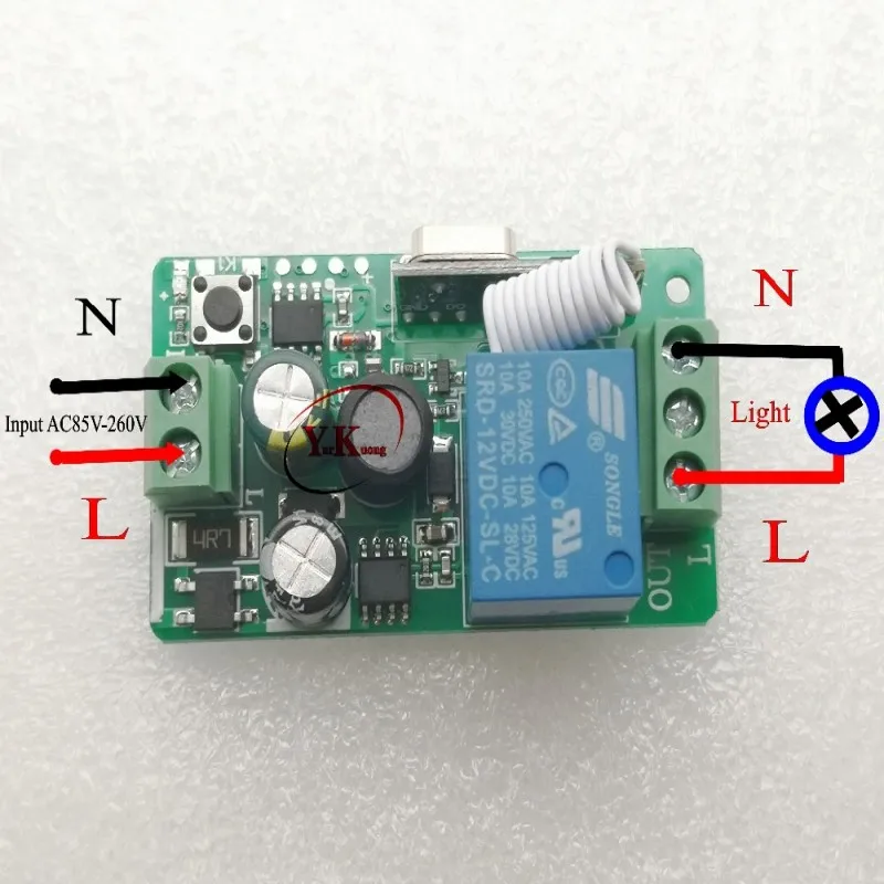 Рабочее напряжение: AC85V-260V( AC85V AC100V AC110V AC120V AC220V AC230V AC240V AC260V all is ok) Рабочая частота: 315 МГц или 433 МГц optionalquiescing ток: менее 10 рабочих температур:-Чувствительность приёма 10'c-+ 60':-105dBmWorking Distance: 10-100mModulation Mode: сверхгетеродинная Максимальная нагрузка: 10А реле имеет 10А реле, резистивная нагрузка ≤ 5А, Индуктивная нагрузка ≤ 3AMatching motod: кнопка обучения для добавления режима пропускания: Мгновенный/тумблер/защелка/мгновенная задержка выключения 5s/10s/15 Размер платы: 55 мм * 32 мм * 17 мм Размер корпуса: 73 мм * 36 мм * 23 мм