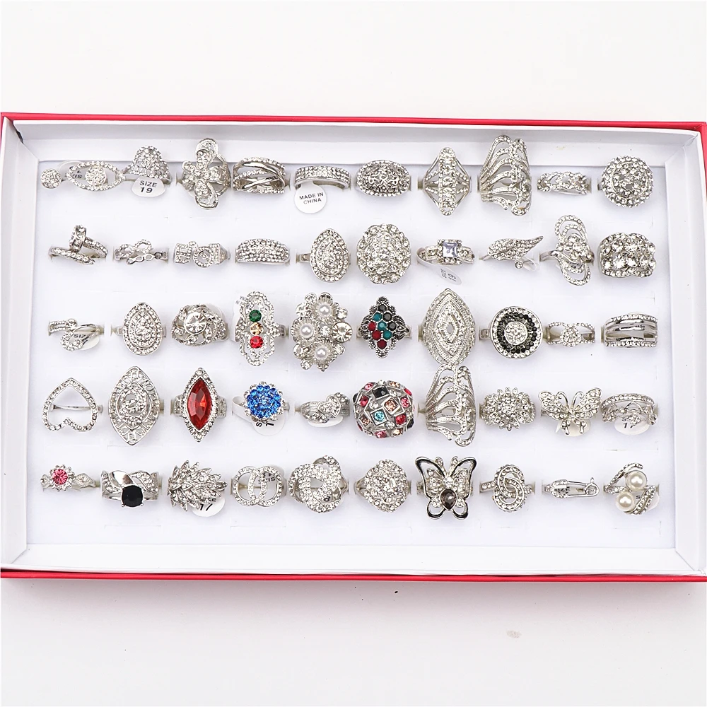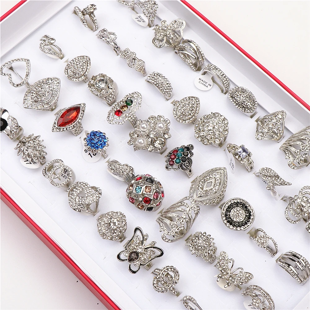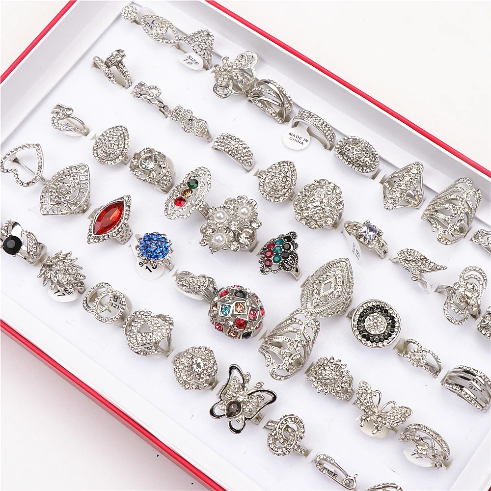Оптовая продажа 20 шт.лот в винтажном стиле, с цветочным узором из металла с серебряным покрытием Стразы ювелирное изделие, кольца для женщин Размеры 17 мм до 19 мм в диаметре, различные Стиль