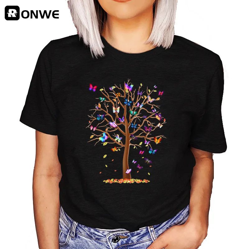 Женская Черная футболка с 3D изображением дерева и бабочек, летняя повседневная короткая футболка в стиле Харадзюку, женская футболка, Новое поступление 2021, Прямая поставка