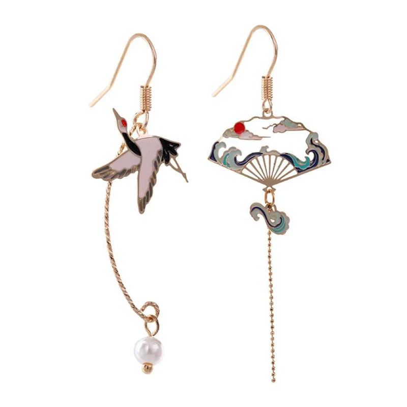 Серьги-подвески в китайском стиле женские, асимметричные Висячие ювелирные изделия из металла со складными веерами, подвеской в форме облака и журавля