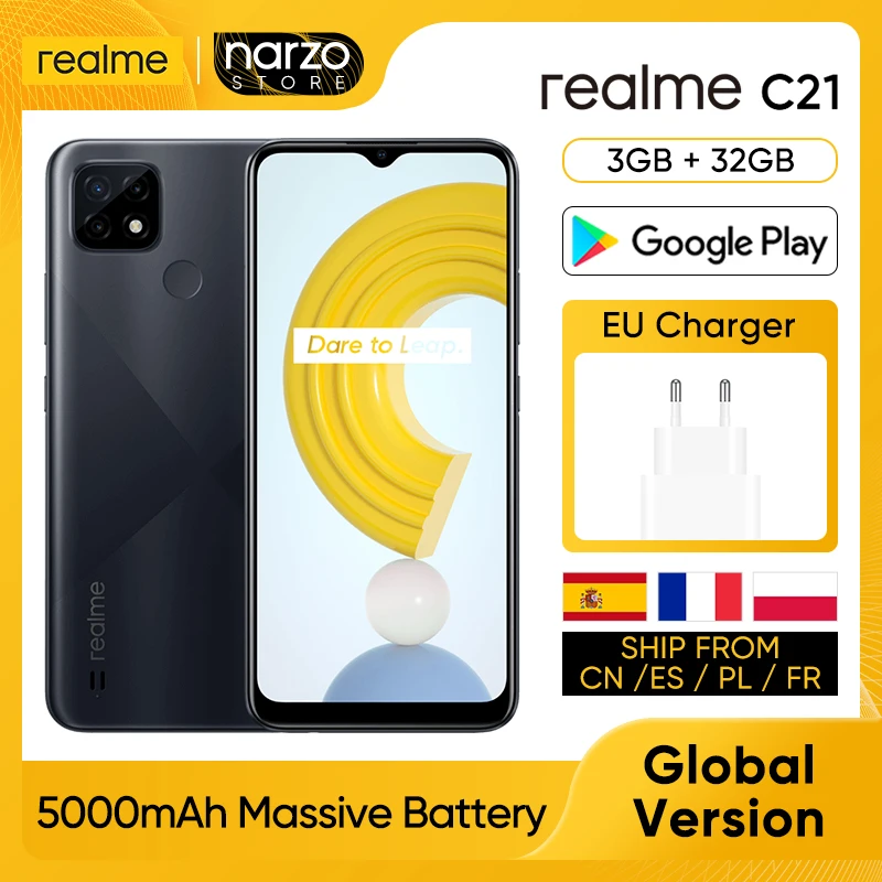 Realme C21 RMX3201 Мобильный телефон Глобальная версия 3GB RAM 32GB ROM MTK Helio G35 6.5'' ЖК-экран 13MP AI тройная камера 5000 мАч Android Разблокировка по отпечатку пальца