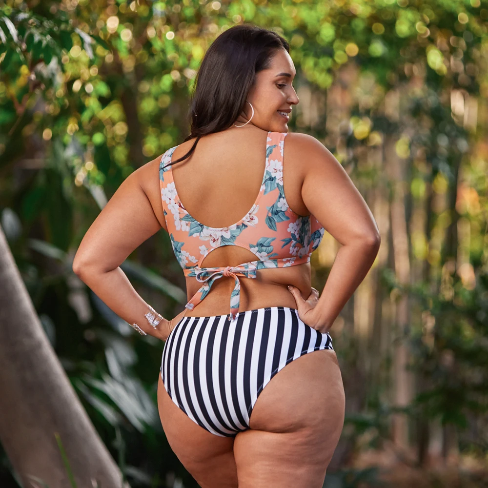 Наши цветочные и полосатые бикини размера плюс дают все правильные тропические вибрации. Цветочный Топ бикини с мягкими чашечками и широкими лямками, которые помогут сохранить все на месте. Бикини дно имеет завязки, обернуть вокруг вашей талии.
