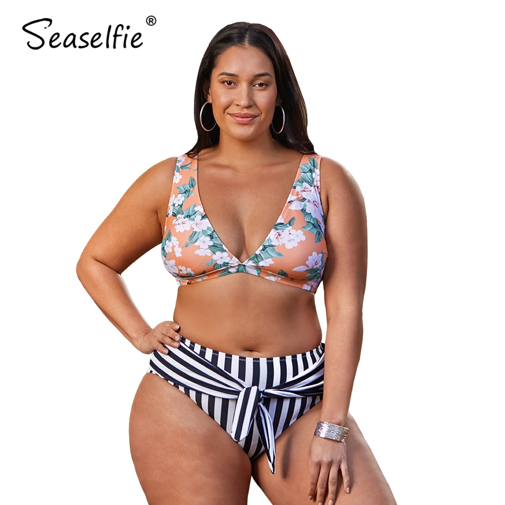 SEASELFIE женский цветочный купальник с высокой талией, комплект бикини, Женский сексуальный купальник большого размера на шнуровке из двух предметов, новинка 2022, купальный костюм
