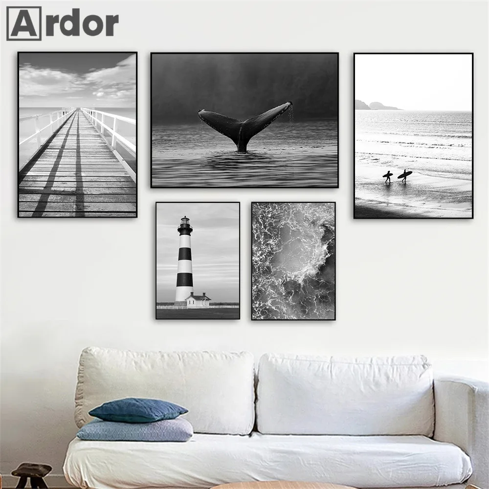 Черно-белая Картина на холсте с изображением моста маяков, фотообои для океана, пляжа, птицы, картина на стену, нордическая картина, декор для гостиной