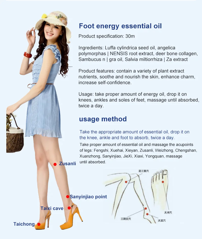 Использование: Возьмите необходимое количество энергетического масла, опустите его на колени, лодыжки и подошвы ног, массируйте до впитывания, два раза в день.