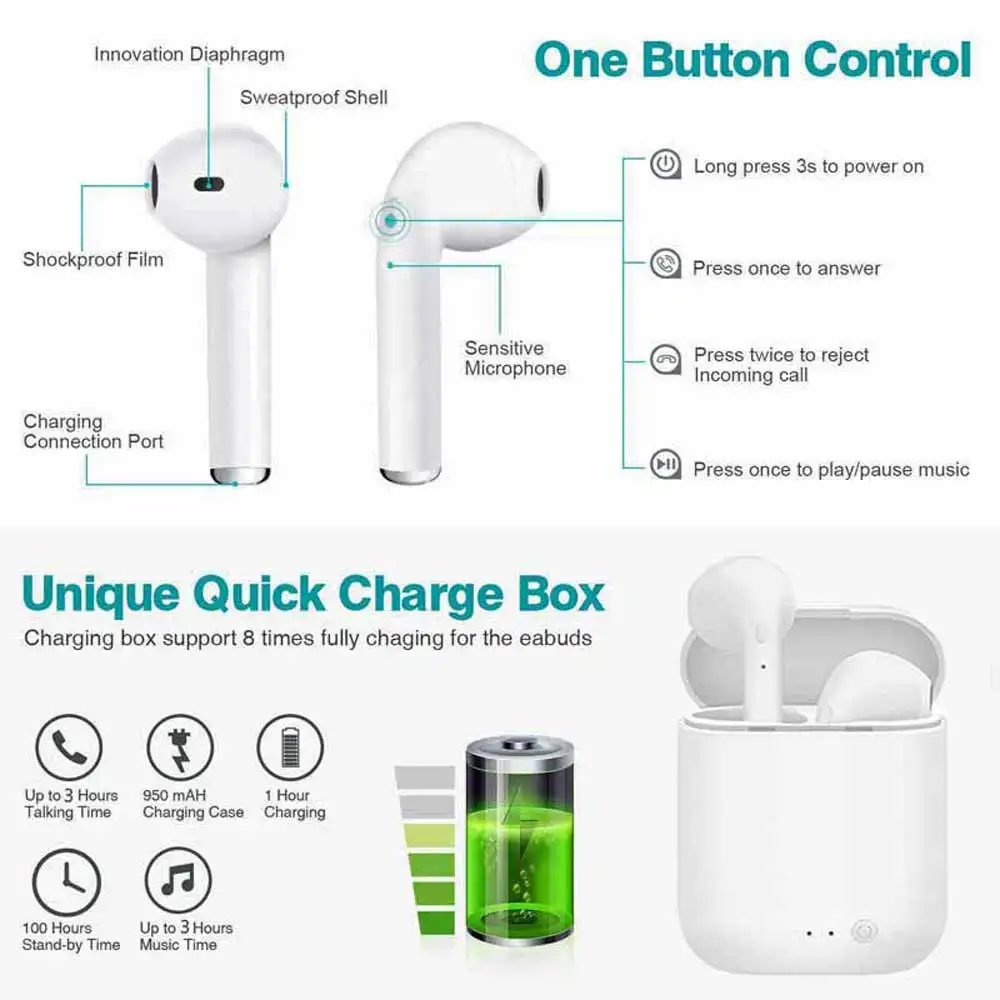 Примечание: у этого товара нет коробки для розничной упаковки!Уважаемый покупатель:При покупке этой Bluetooth-гарнитуры, пожалуйста, прочтите следующие инструкции: из-за длительной транспортировки мощность tws будет исчерпана. Вы не сможете использовать гарнитуру, когда получите посылка ЛКУ. Он может быть выключен. Первое, что нужно сделать-зарядить гарнитуру в течение 60 минут. Очень важно. Спасибо!Особенности:1. Корректное прослушивание песни, поддержка песен и звонков,2. Напоминание номера вызова, последний обратный вызов, все интеллектуальные китайские и английские голосовые подсказки, загрузка, сопряжение, отключение питания телефона будут низкими голосовыми подсказками;3. Мощность будет отображаться на вашем Iphone, вы сможете видеть состояние питания в любое время, не беспокойтесь о электричестве, не беспокойтесь о своей жизни;4. Можно подключить от одного до двух мобильных телефонов одновременно5. Bluetooth-гарнитура подключилась к телефону после выключения, а затем откройте Bluetooth-гарнитуру, которая автоматически подключится к телефону, что более удобно;6. Интеллектуальная Совместимость: поддерживает все Bluetooth мобильный телефон, планшеты, ноутбуки, пение, музыку QQ, фильмы и т. д., универсальные все мобильный телефонСпецификация:Модель: Mini-2 TWSВерсия Bluetooth: Bluetooth 5,0Дальность передачи: внешнее расстояние прямой линии 10-15 метровЕмкость аккумулятора: полимерный литиевый аккумуляторФункция: быстрая зарядка, HD-вызовВремя прослушивания музыки: около 2 часовВремя звонка: около 2,5 часовВремя в режиме ожидания: 130 часаВремя зарядки: 1-2 часаПосылка входит:2 мини-наушника Bluetooth (левый и правый наушники)1 х зарядная коробка1 x USB-кабель для зарядки1 х Руководство пользователяПримечания:1. Это высококачественные TWS mini-2 и Беспроводные стереонаушники bluetooth с хорошим звуком. Теперь все устройства оснащены bluetooth 5,0, двойное ухо имеет голос При звонках.