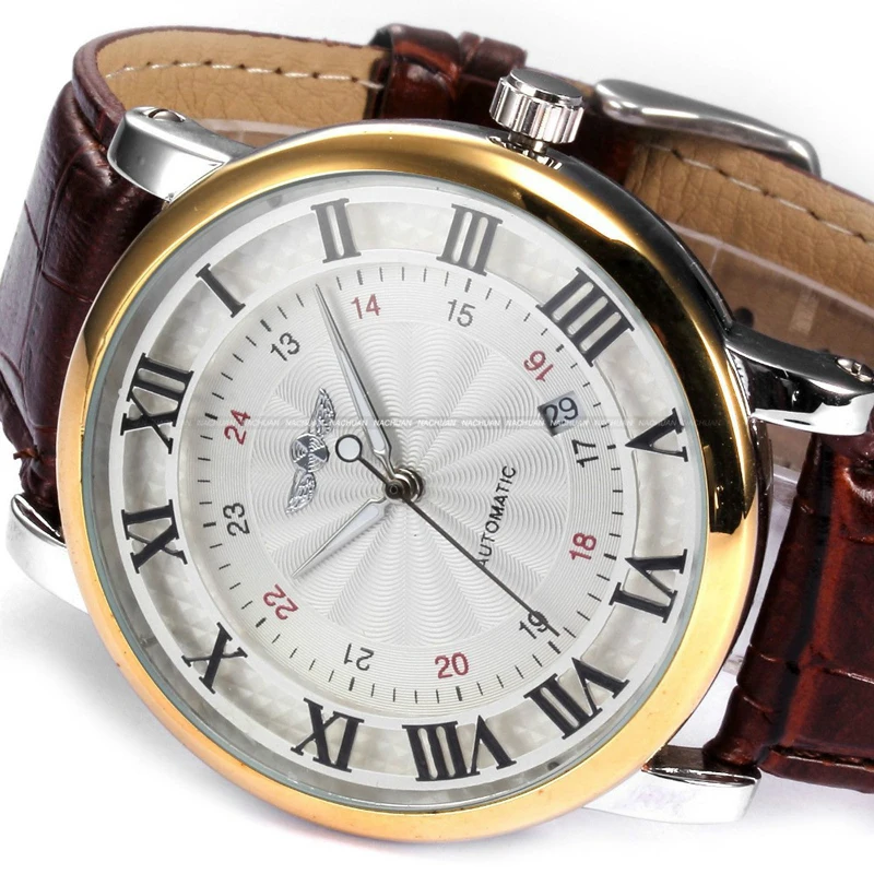 Часы наручные мужские с цифрами, модные повседневные брендовые золотистые спортивные автоматические механические часы с автоподзаводом, с календарем и кожаным ремешком, в римском стиле