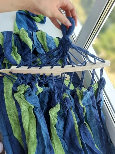 Гамак отличный, взял на 1.5 метра шириной. Крепления крепкие (кольца сварены - не разогнутся). Ткань рыхлая и приятная, тянется, но при том держит хорошо. Если лежишь один, то можно даже почти полностью завернуться в ткань. Сохнет после утренней росы очень быстро на ветру. Фанерные распорки только не покрашены - будут размокать и мараться, покрашу лаком самостоятельно.