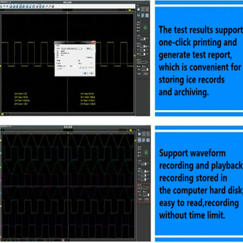 Поддержка записи и воспроизведения формы волны. Форму волны можно сохранить на жестком диске компьютера и легко читать. Нет ограничений на время записи, которое может длительное измерение и запись формы волны для устранения неполадок.