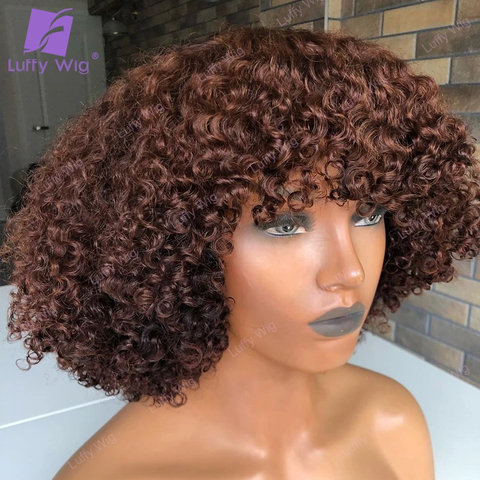 Парик с кудрявыми волосами коричневого цвета, человеческие волосы с челкой, бразильский парик с кудрявыми волосами без клея для темных женщин, Luffywig