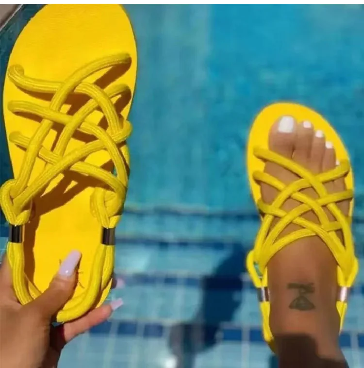 Женские босоножки; Плетеная Летняя обувь; Женские босоножки на плоской подошве ярких цветов; Chaussure Femme; Пляжные женские шлепанцы; Повседневные летние сандалии