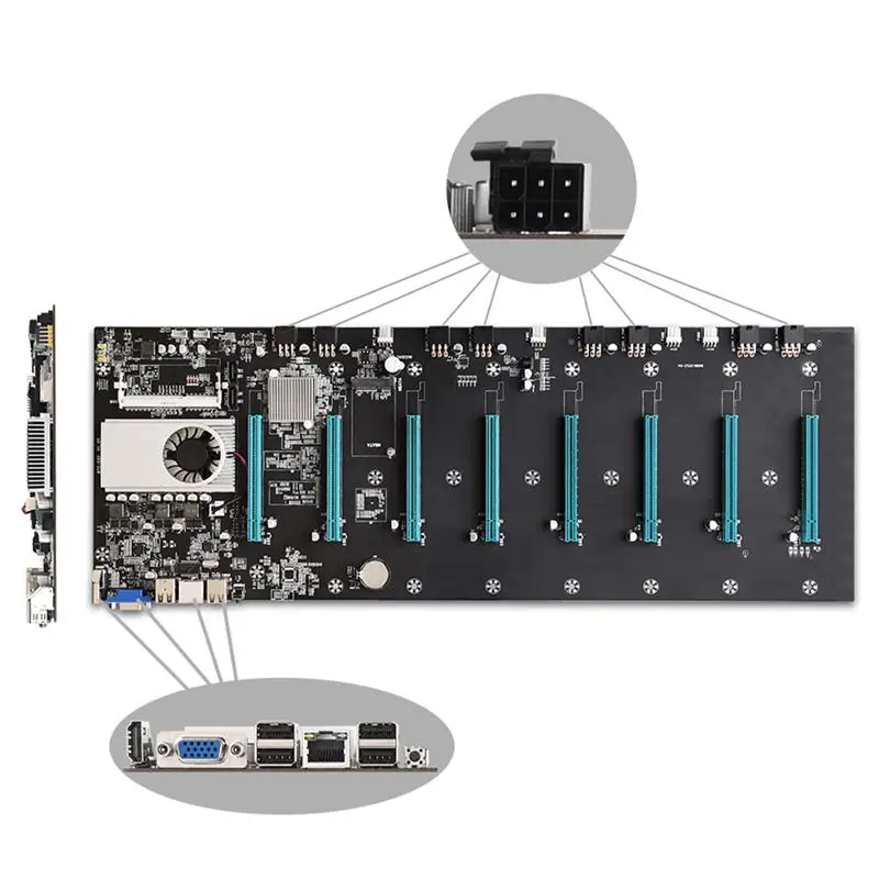 Описание:8 * PCIE 16X слоты для видеокарт, 575 мм интервал.Высокая производительность вычислений, на 10% выше, чем Материнские платы того же уровня.Оснащен слотом памяти Sodimm DDR3, разъем питания 8*6pin PCIE X16, что значительно повышает производительность материнской платы.Стабилизирующий конденсатор напряжения может обеспечить стабильное напряжение для вашего оборудования электропитания.Он может обеспечить тихую производительность, низкое энергопотребление, меньшее количество тепла, энергосбережение и безопасное использование.Характеристики:Наименование товара: материнская плата для горнодобывающей машиныМодель: BTC-37Цвет: черный + синийРазмер: 575x195 ммПамять: 1 * DDR3 Sodimm слот, поддержка 1066/1333/1600 МГцХранение: 1 * SATA3.0 + 1 * SATA2.0 + 1 * m SATA2.0USB: 4 * USB2.0Сетевой порт: гигабитный сетевой порт RJ45Расширяемый порт: 8 * PCIE 16X,8*6pin PCIE X16 разъем питания, HDMI-совместимый + VGAПримечание:-Возможны небольшие погрешности в размере при ручном измерении.-Отклонение цвета может отличаться из-за различных настроек монитора, пожалуйста, поймите.Упаковочный лист