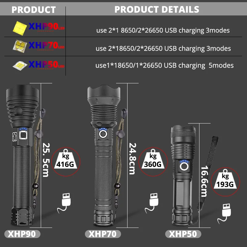 Самый мощный светодиодный фонарик xhp90.5, 900000 люмен, тактический фонарь с зарядкой от usb, 18650, 26650, 100 Вт